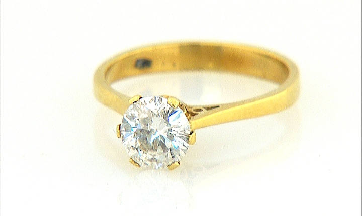 ANELLO. In oro giallo 18 kt con diamante taglio brillante disposto a solitario per tot. cts. 1,00 ca. (prob. colore J purezza P), entro castone a sei griffes.