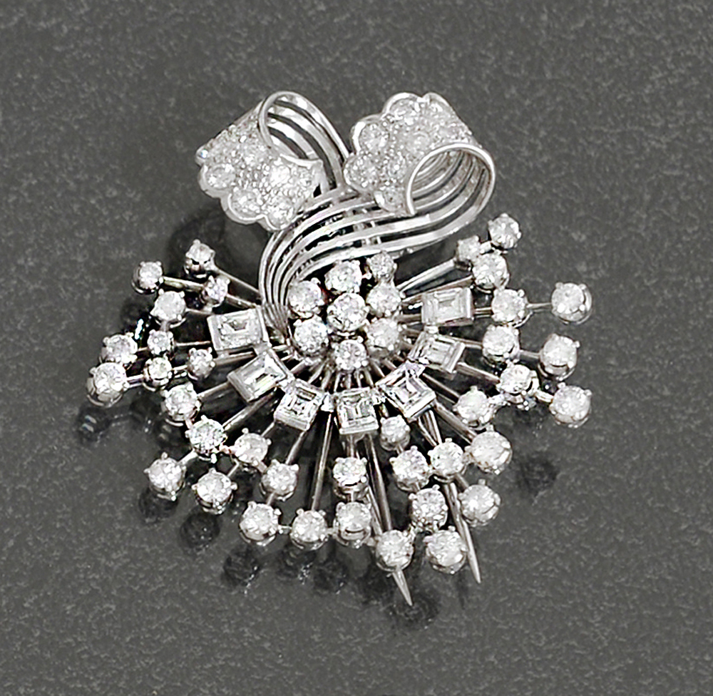 SPILLA ANNI '60 CA. In oro bianco 18 kt motivo superiore a raggiera con decoro a volute nella parte terminale, diamanti taglio brillante, huit-huit e baguette per tot. cts. 3,00 ca., chiusura a doppio ago.