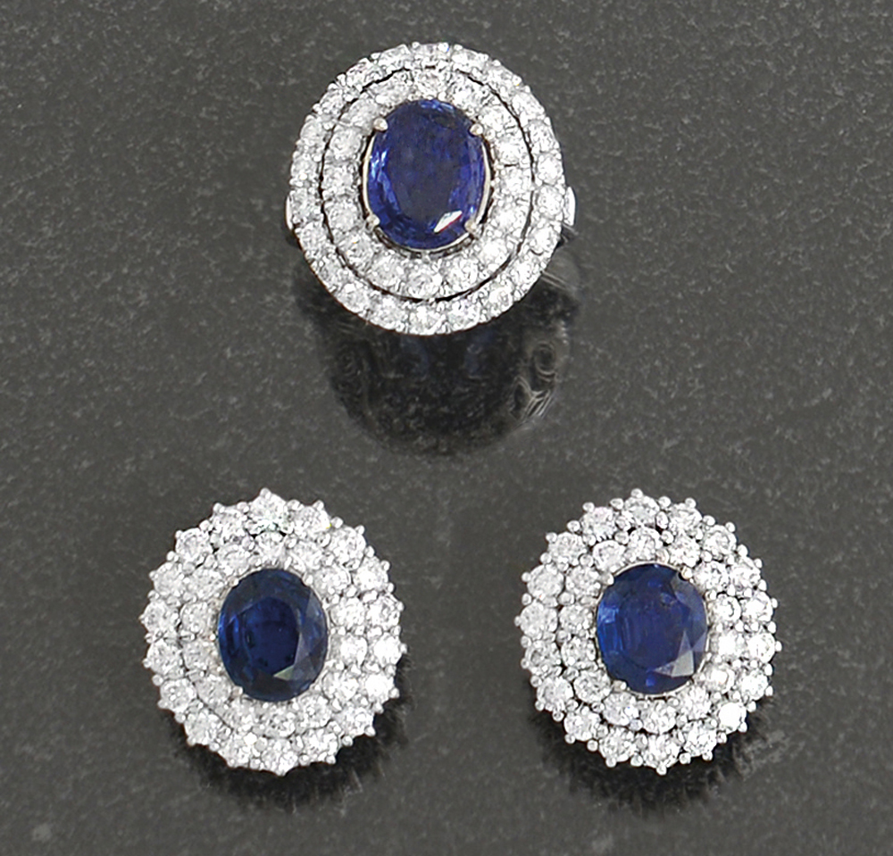 DEMI PARURE. In oro bianco 18 kt composta da coppia di orecchini perno e clip e da anello con zaffiri taglio ovale per tot. cts. 9,00 ca. entro doppia cornice in diamanti taglio brillante per tot. cts. 5,50 ca. (prob. colore G purezza VVS).