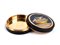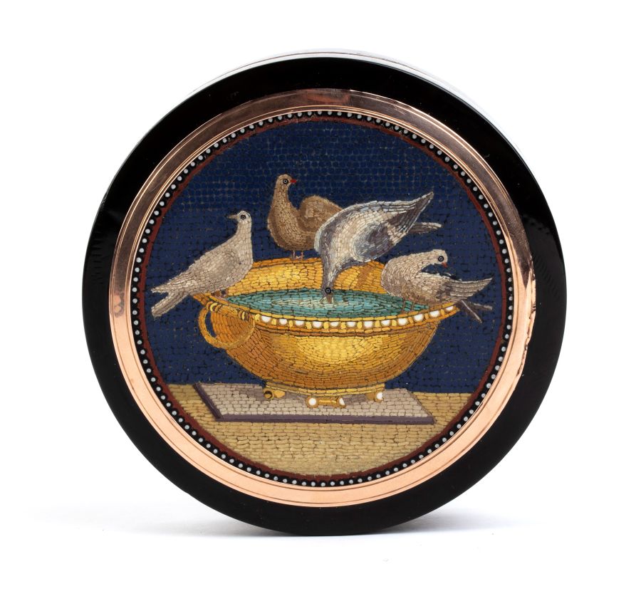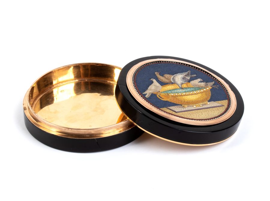 Altezza x diametro: 2,3 x 7,6 cm. Peso: 123 gr. di forma rotonda, realizzata in tartaruga (hawksbill sea turtle, Eretmochelys imbricata, Cheloniidae) con interni e dettagli esterni in oro giallo; il coperchio con micromosaico romano raffigurante Le Colombe di Plinio, schema compositivo spesso utilizzato dal celebre mosaicista romano Giacomo Raffaelli e da altri mosaicisti. In questa rappresentazione sono rappresentate quattro colombe sull’orlo di un cantaro in bronzo dorato colmo d’acqua, dal quale una di esse si abbevera.