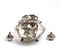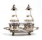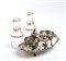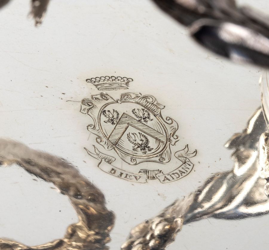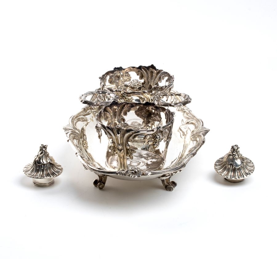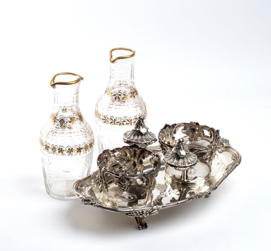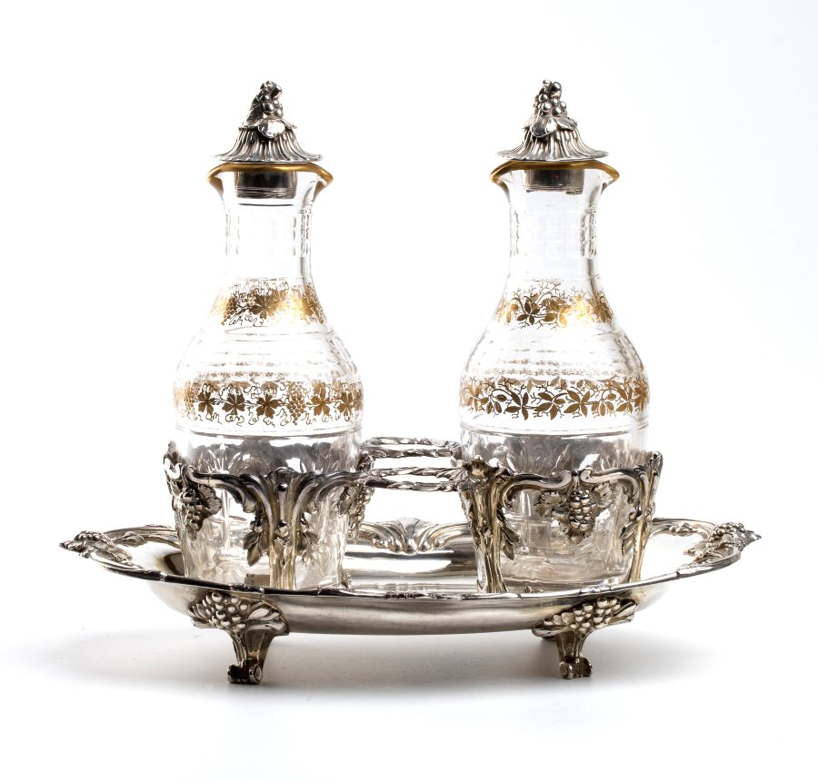 Altezza x larghezza x profondità: 21 x 28 x 12 cm. Peso lordo complessivo: 1655 gr. Peso netto dell'argento: 935 gr circa. di forma ovale, poggiante su quattro piedini decorati a motivi vegetali e raffiguranti grappoli d'uva che si ripetono anche sui bordi e sui porta bottiglie. Il tema ripetuto della vite compare, dorato, anche nelle due bottiglie in vetro intagliato con applicazioni in oro. Le oliere sono dotate di due tappi con prese a forma di vite.