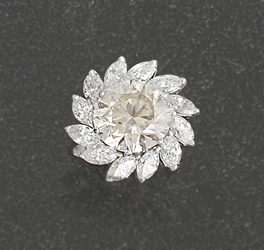 ANELLO. In oro bianco 18 kt con al centro un diamante brunito taglio brillante di cts. 5,50 ca. purezza P entro cornice in diamanti taglio navette per tot. cts. 2,00 ca.