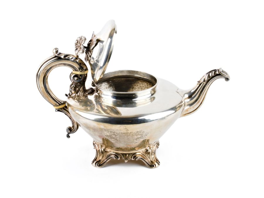 la teiera, la lattiera e la zuccheriera presentano la serie completa dei marchi in uso a Londra nel 1844-1845, argentiere William Ker Reid.