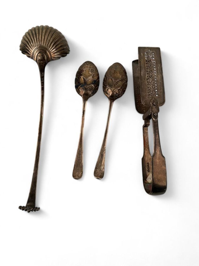 Peso totale: 405 gr. 1) coppia di cucchiai in argento 925/1000 sbalzati e cesellati con nature morte: