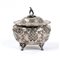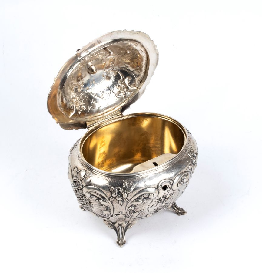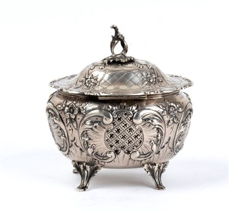 Altezza x larghezza x profondità: 17 x 15,5 x 13 cm. Peso: 685 gr. in argento, di forma ovale. Poggia su quattro piedini fogliati, il corpo bombato è riccamente decorato con motivi a volute fogliati e floreali. Il coperchio incernierato, decorato con motivi analoghi, è sormontato da una presa con un motivo fogliato.