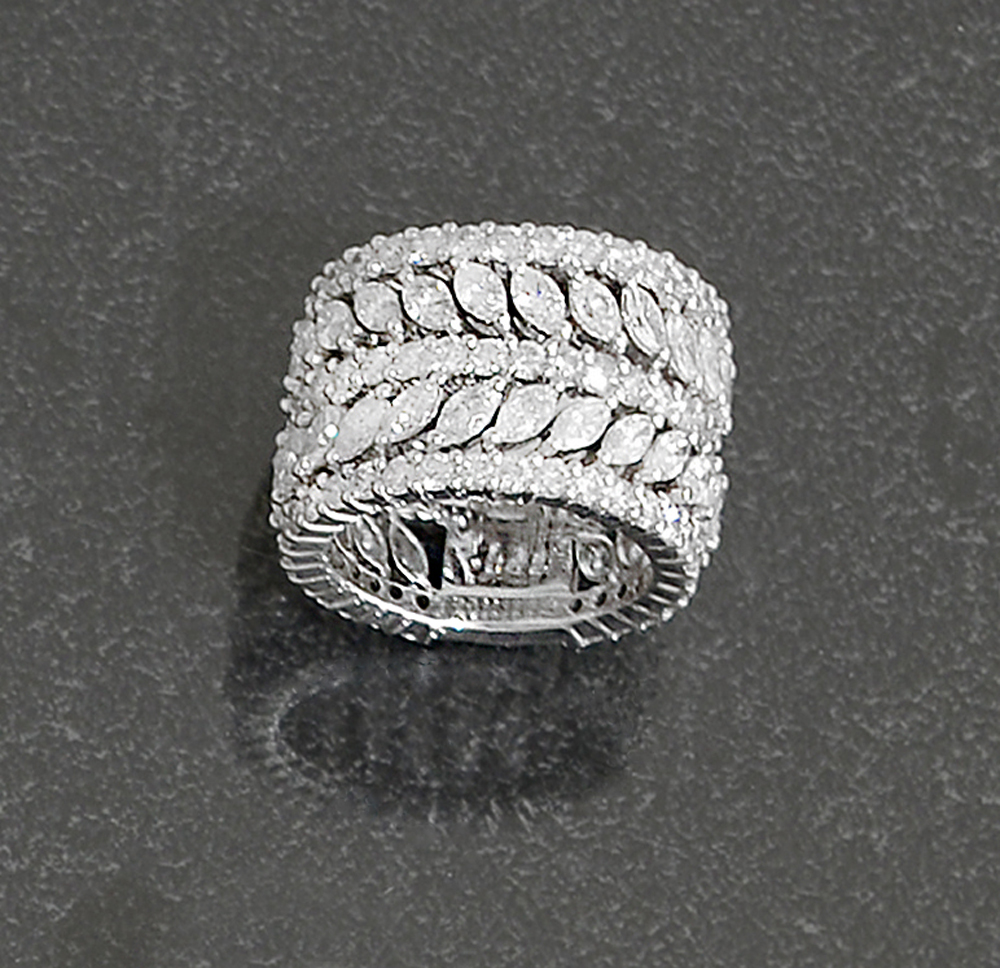 ANELLO ETERNEL. In oro bianco 18 kt a grande fascia con diamanti taglio brillante e navette per tot. cts. 7,13 (caratura incisa).