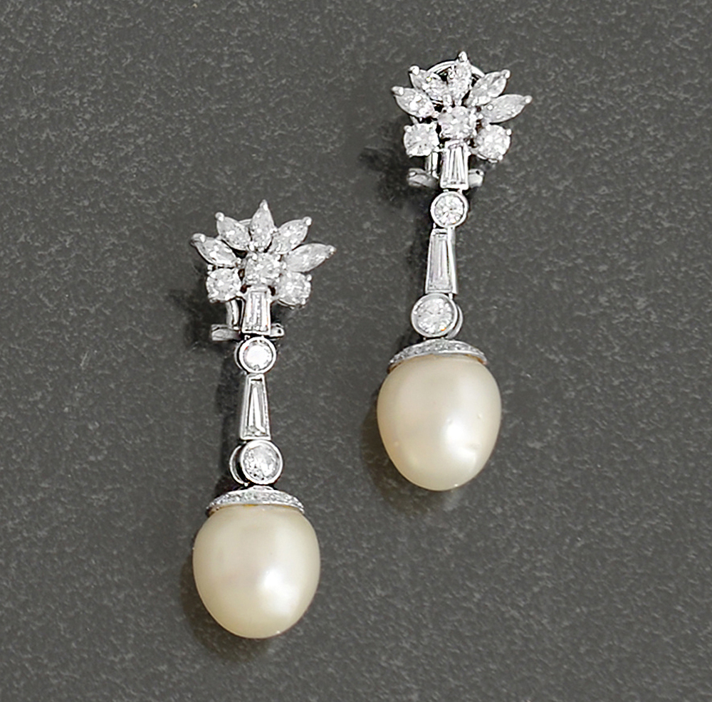 COPPIA DI ORECCHINI PENDENTI. In oro bianco 18 kt perno e clip, motivo superiore in diamanti taglio navette, brillante e tapered baguette per tot. cts. 2,40 ca., perle coltivate leggermente ovalizzate di mm 14x12 ca. trattenute da motivi a coppiglia in piccoli diamanti taglio brillante.