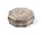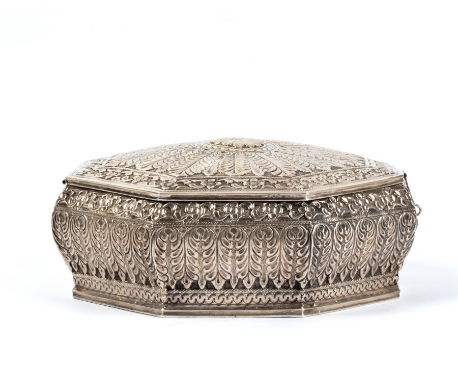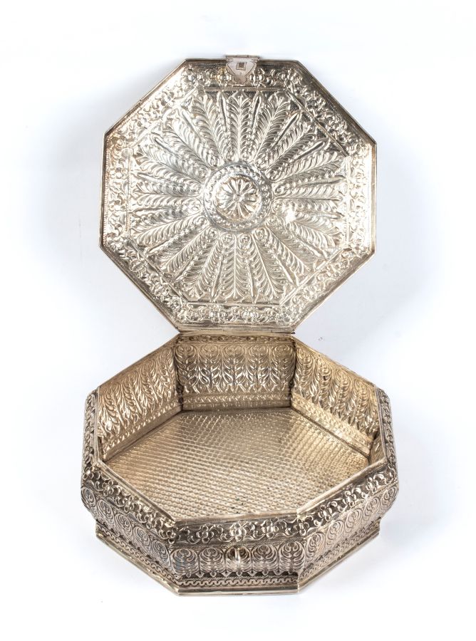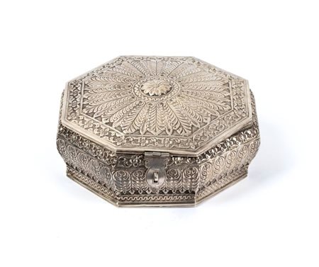 Altezza x larghezza x profondità: 9 x 23 x 23 cm. Peso: 1254 gr. di forma ottagonale, sbalzata e cesellata con l’intera superficie riccamente decorata a motivi fogliati e a volute, distribuiti in modo uniforme e divisi per fasce geometriche. Il coperchio incernierato presenta le stesse decorazioni e al centro una margherita stilizzata.