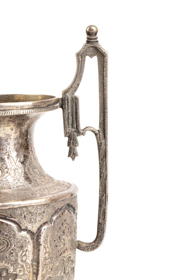 Altezza x larghezza x profondità: 26x10x13 cm. Peso complessivo: 487 gr. a forma di anfora biansata, su piede circolare; l’intera superficie riccamente sbalzata e cesellagta. Il repertorio decorativo include intricati arabeschi intrecciati, elementi floreali stilizzati e figure animali.