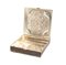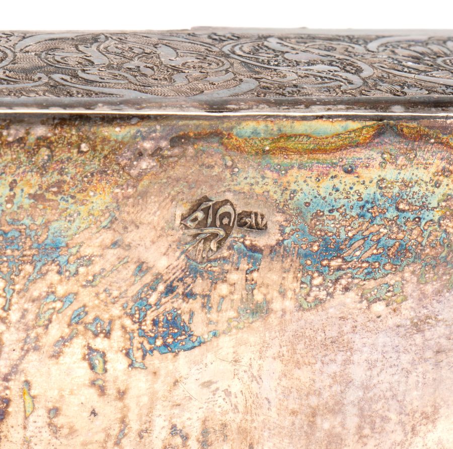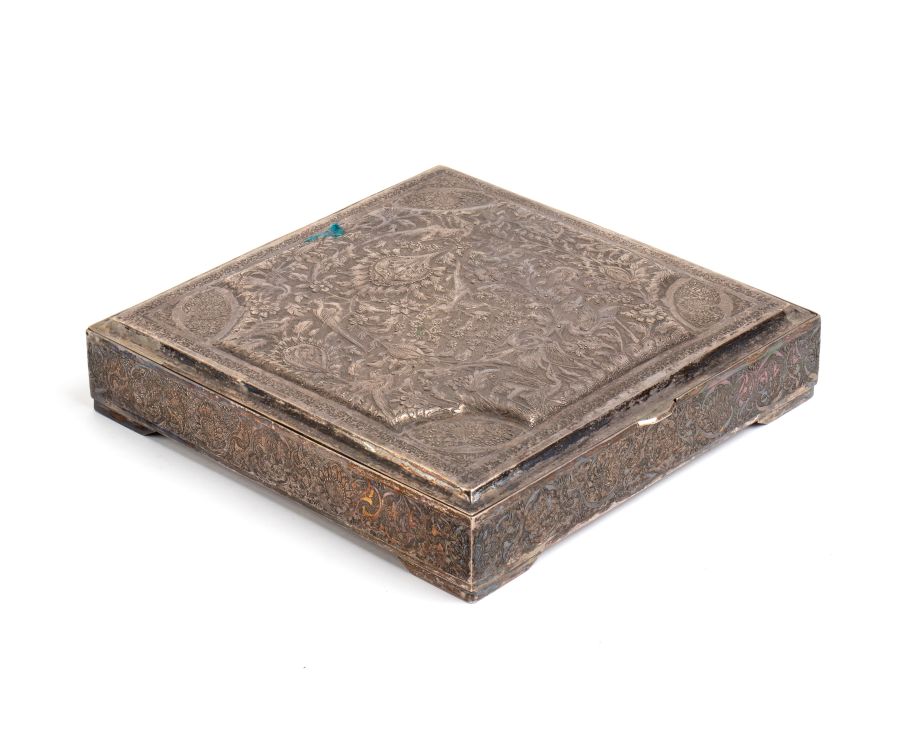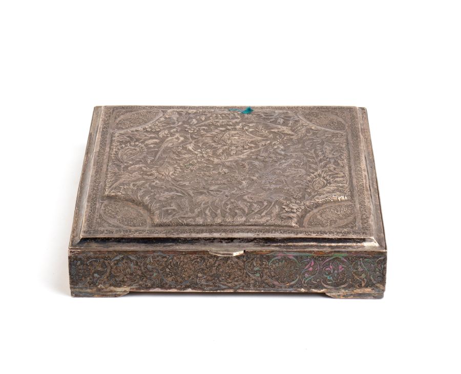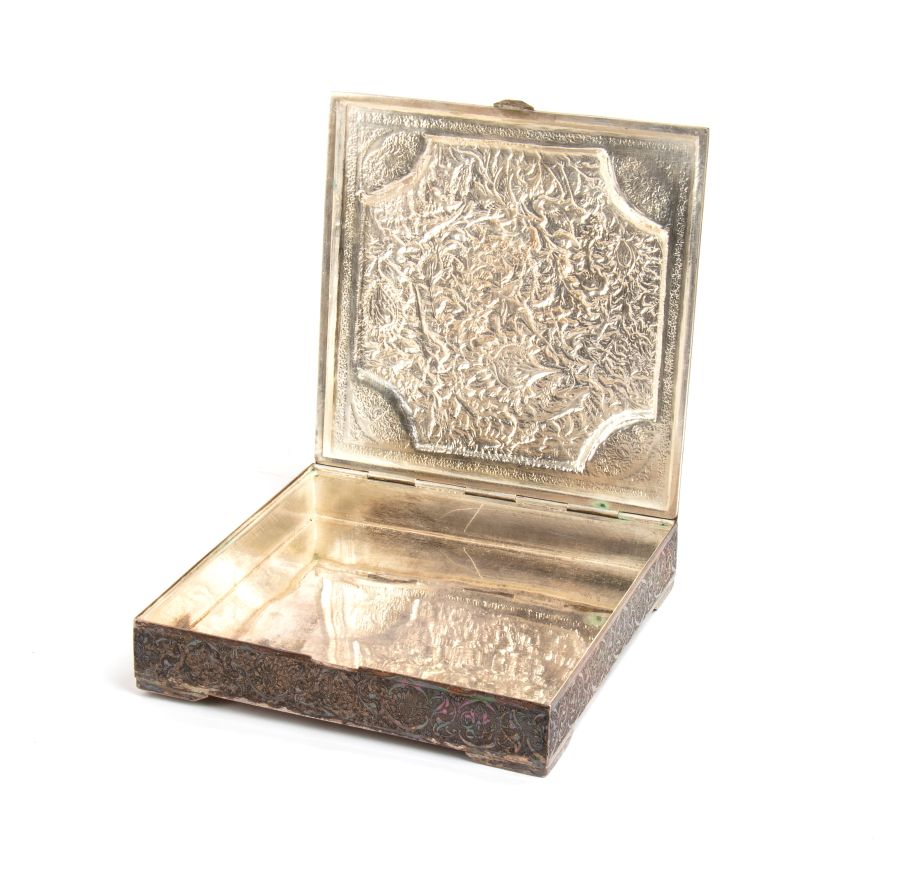 Altezza x larghezza x profondità: 3x18,5x18,5 cm. Peso: 706 gr. di forma quadrata con chiusura incernierata. L'intera superficie è decorata a sbalzo e cesello con motivi a volute floreali, fogliati e animali. La scatola poggia su quattro piedini angolari collocati agli spigoli, che seguono il profilo dell’angolo.