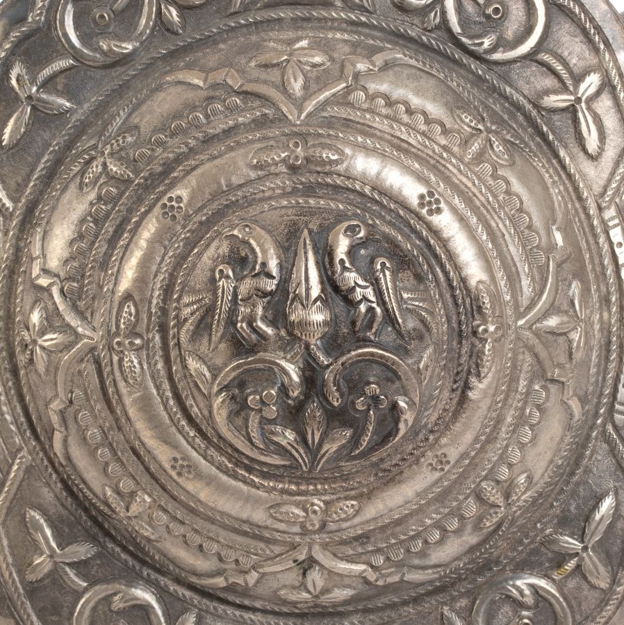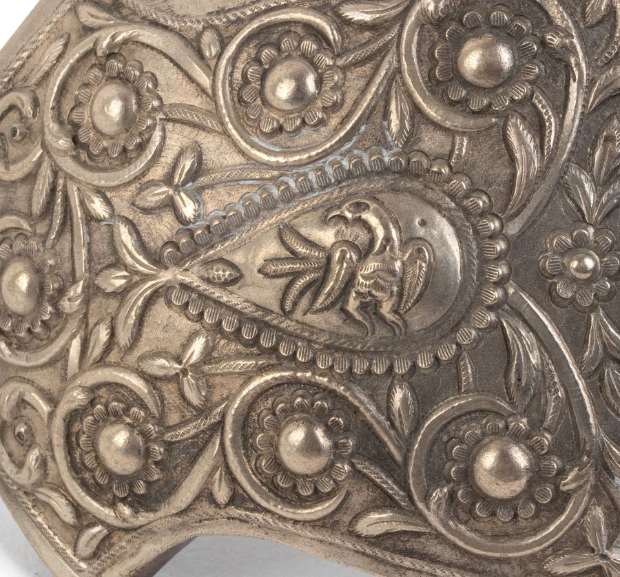 Altezza x larghezza: 39 cm. Peso: 506,4 gr. in metallo argentato, costituita da due elementi che si uniscono sul retro tramite un sistema di incastro. La superficie è ornata con motivi a volute fogliate e floreali, tipici dell’arte ornamentale dell’area himalayana. La parte centrale della fibbia è di forma ovale, evidenziata da una decorazione a cerchi concentrici che incorniciano la scena principale: due uccellini affrontati, probabilmente simbolici, posizionati uno di fronte all’altro in posizione speculare. Gli uccelli, elementi ricorrenti nell’arte nepalese e tibetana, possono rappresentare l’unione, la prosperità o la spiritualità, a seconda del contesto culturale e religioso. Fibbie simili erano spesso usate per ornare cinture femminili nei costumi cerimoniali o tradizionali delle etnie dell’area himalayana, sia come elemento funzionale che come gioiello decorativo.