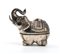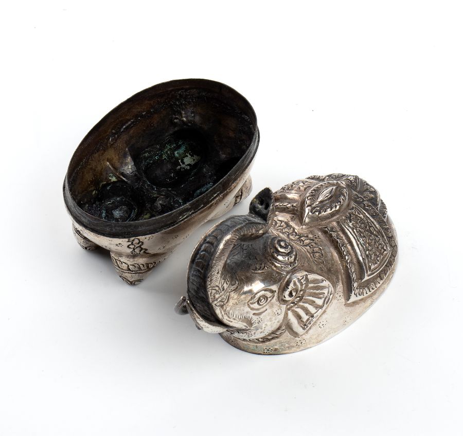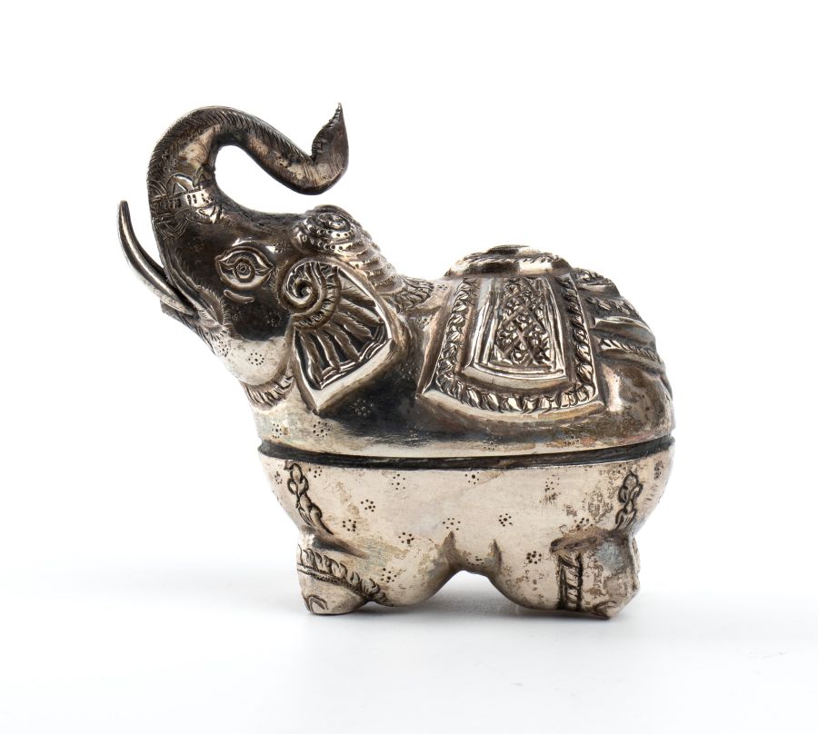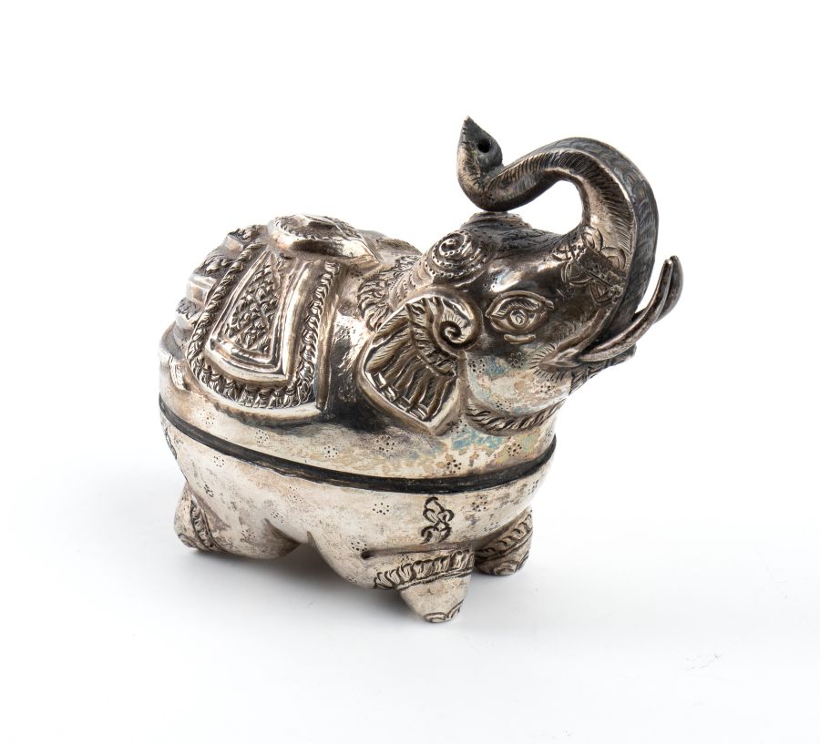 Altezza x larghezza x profondità: 8,7 x 10 x 4,8 cm. Peso: 93 gr. in argento a forma di elefante khmer finemente decorata.