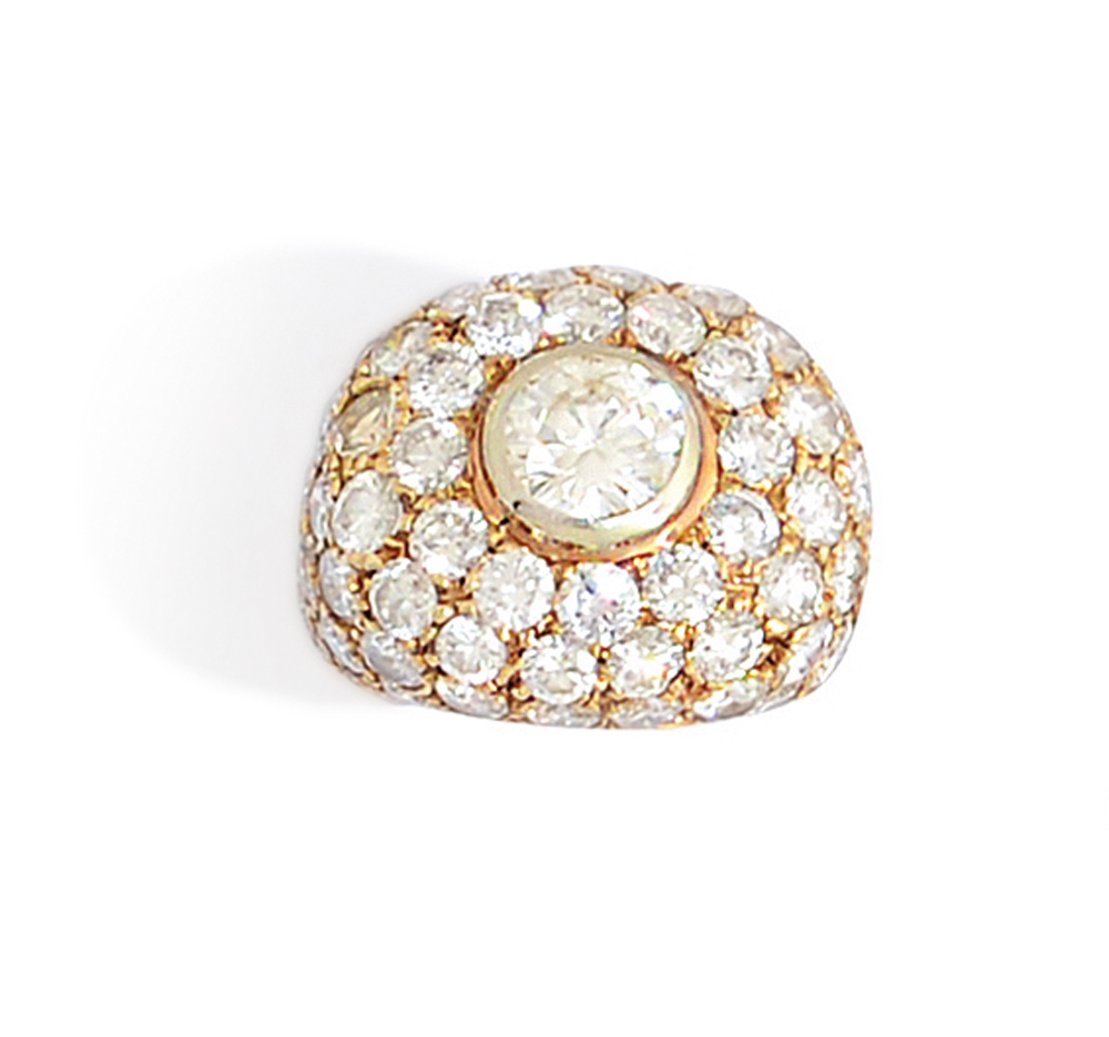 ANELLO. In oro giallo 18 kt con al centro un diamante taglio brillante entro castone ribattuto di cts. 1,70 ca. (prob. colore L/M purezza VS) e diamanti taglio brillante a decoro della montatura per tot. cts. 7,00 ca.