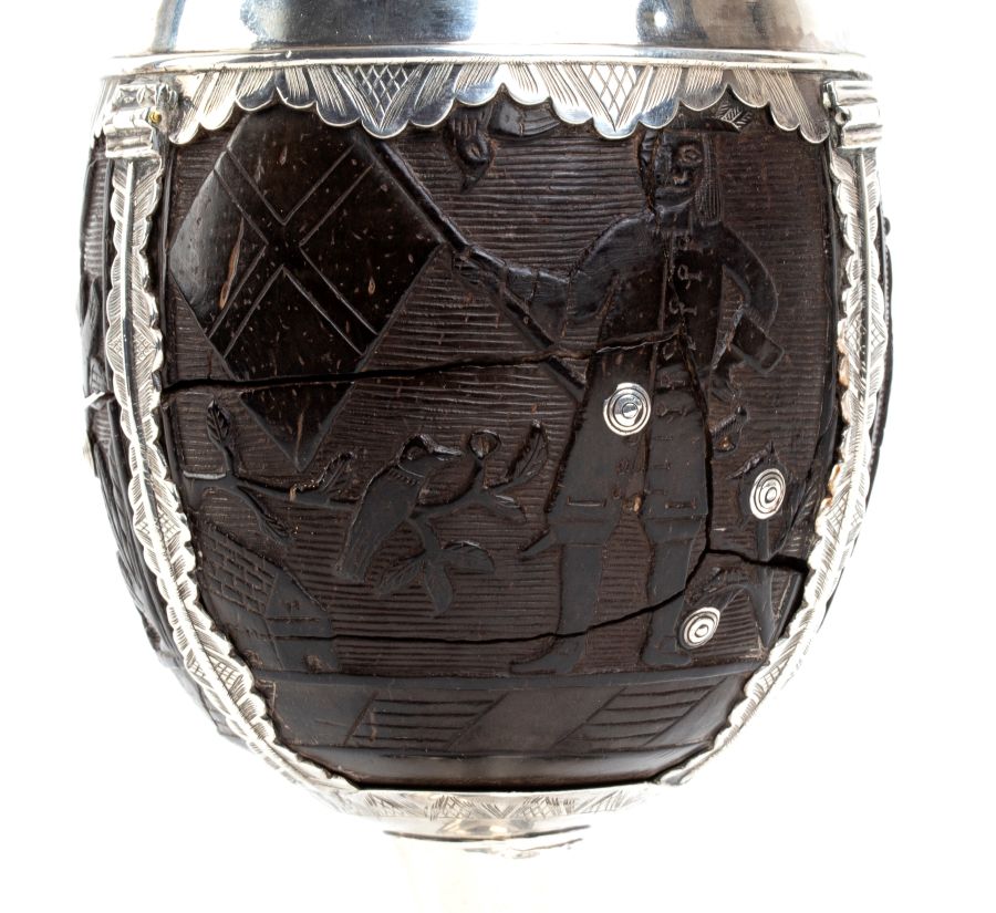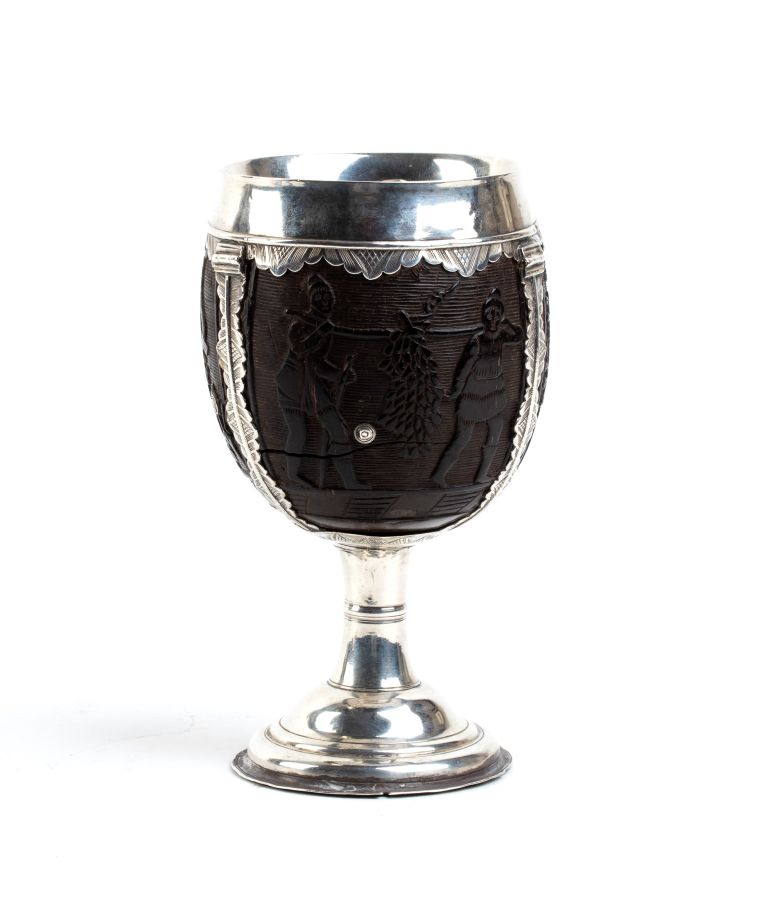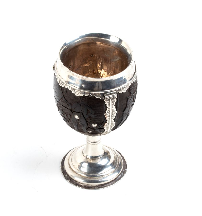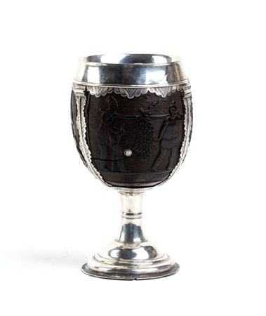Altezza x diametro: 17 x 9,5 cm. Peso: 320 gr. composta da una base e da una struttura portante in argento su cui è montata una noce di cocco. La base in argento è tornita e sagomata, mentre il frutto è sorretto da sottili fasce in argento che abbracciano la superficie curva della noce, collegandola stabilmente alla base. Il bordo superiore della coppa è rifinito con una fascetta in argento decorata con motivi sagomati. La superficie della noce di cocco presenta incisioni in rilievo raffiguranti figure umane e animali, disposte in una composizione narrativa o simbolica.