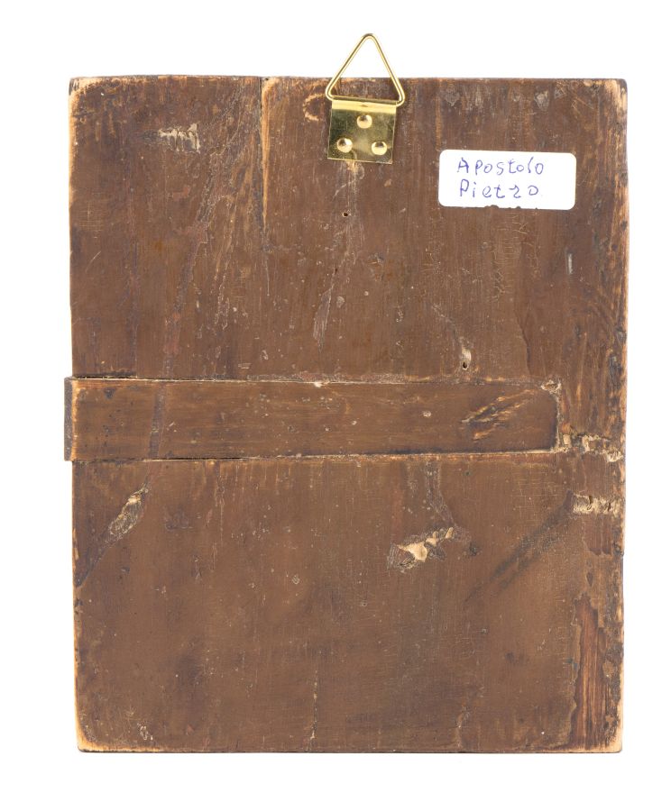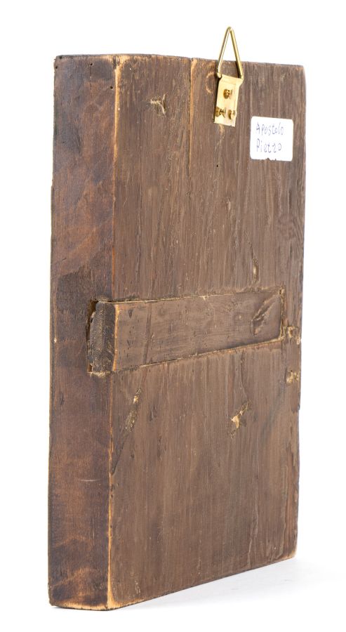 Altezza x larghezza: 17 x 14 cm. In legno, su fondo dorato, compare al centro vi è la figura a mezzo busto di San Pietro, riconoscibile dai tratti caratteristi iconografici quali le chiavi del Paradiso, che tiene nella mano destra ben impugnate e che simboleggiano il potere conferitogli da Gesù: "A te darò le chiavi del regno dei cieli" (Matteo 16,19); e, ancora, il rotolo di pergamena nella mano sinistra che rappresenta la dottrina e le lettere apostoliche. Alla sua destra, in una lunetta, la figura di Gesù Cristo compare tra le nuvole e gli si rivolge; mentre in un'edicola, sempre a destra, compare la figura stante di un arcangelo.