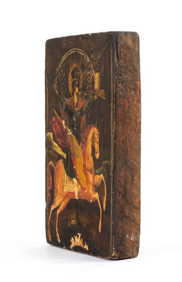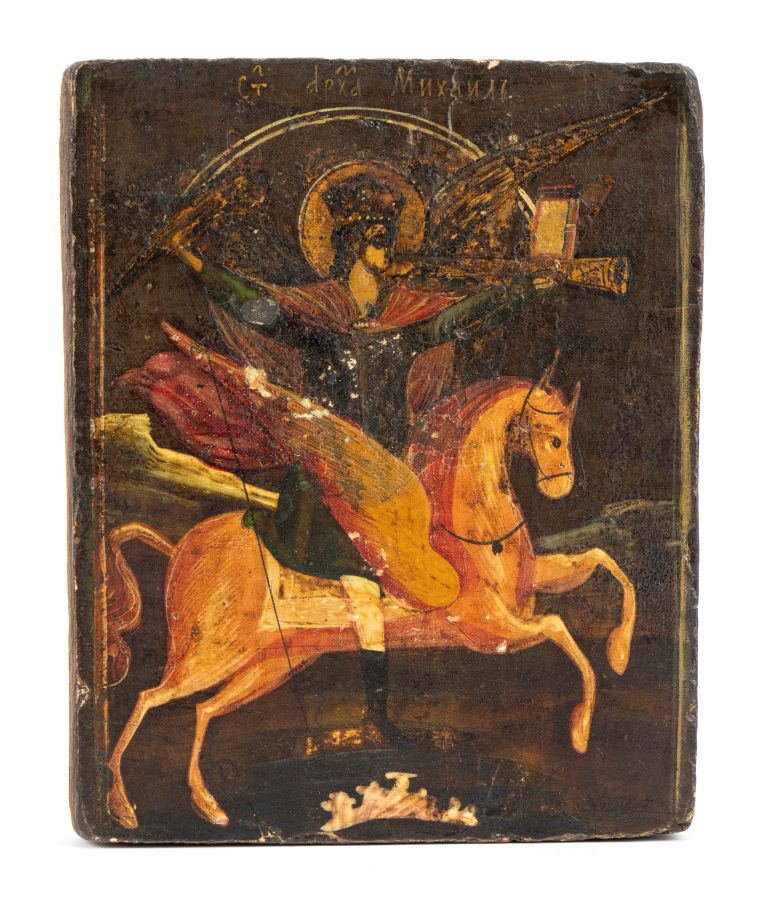 Altezza x larghezza: 15 x 12,5 cm. In russo Михаил, come riportato nella parte superiore dell'icona. Nella tradizione ortodossa, quando San Michele Arcangelo è rappresentato a cavallo, l'iconografia sottolinea la sua autorità di comandante delle schiere celesti nella lotta contro le forze del male. Nell'icona, San Michele è raffigurato mentre cavalca un cavallo alato in battaglia, diretto verso il trionfo, suonando la tromba e agitando la spada, mentre con la mano sinistra tiene la Bibbia.