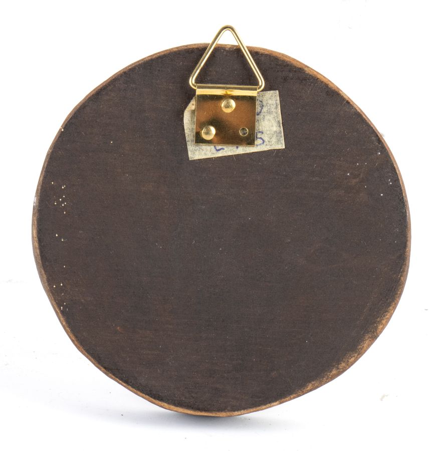Diametro: 10 cm. L'Imago Pietatis è un'iconografia cristiana che rappresenta Cristo sofferente, con le mani piagate incrociate e il volto segnato dalla Passione. In questo caso, il Cristo presenta gli occhi aperti, in simbolo di morte e risurrezione. Nelle icone russe, questa tipologia di raffigurazione, è conosciuta come "Non piangere per me, Madre".