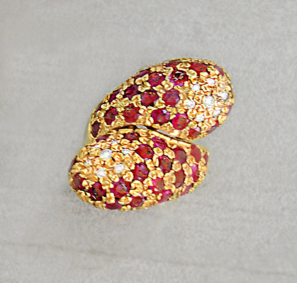 ANELLO. In oro giallo 18 kt internamente foderato realizzato a contrariè, diamanti taglio brillante per tot. cts. 0,30 ca. e rubini taglio rotondo per tot. cts. 7,00 ca.