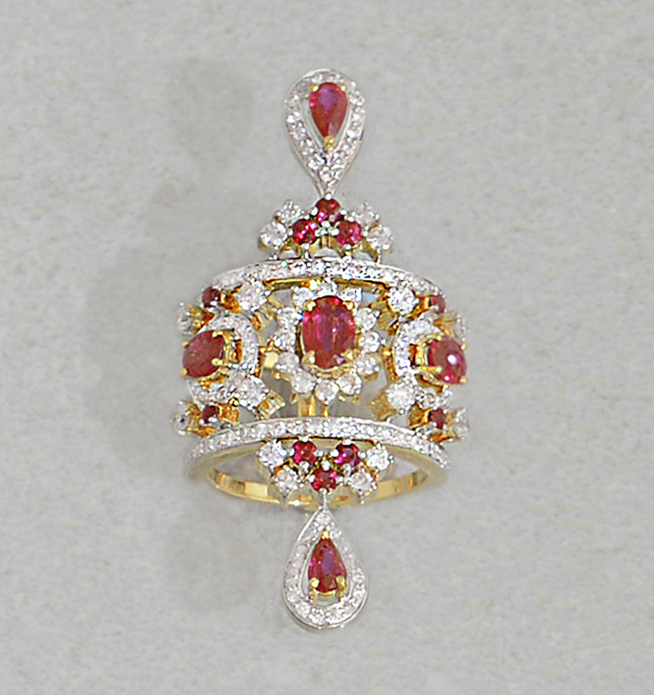 ANELLO. In oro giallo 18 kt con rubini taglio rotondo, ovale e goccia per tot. cts. 2,00 ca. e diamanti taglio brillante per tot. cts. 1,61 (caratura incisa).