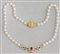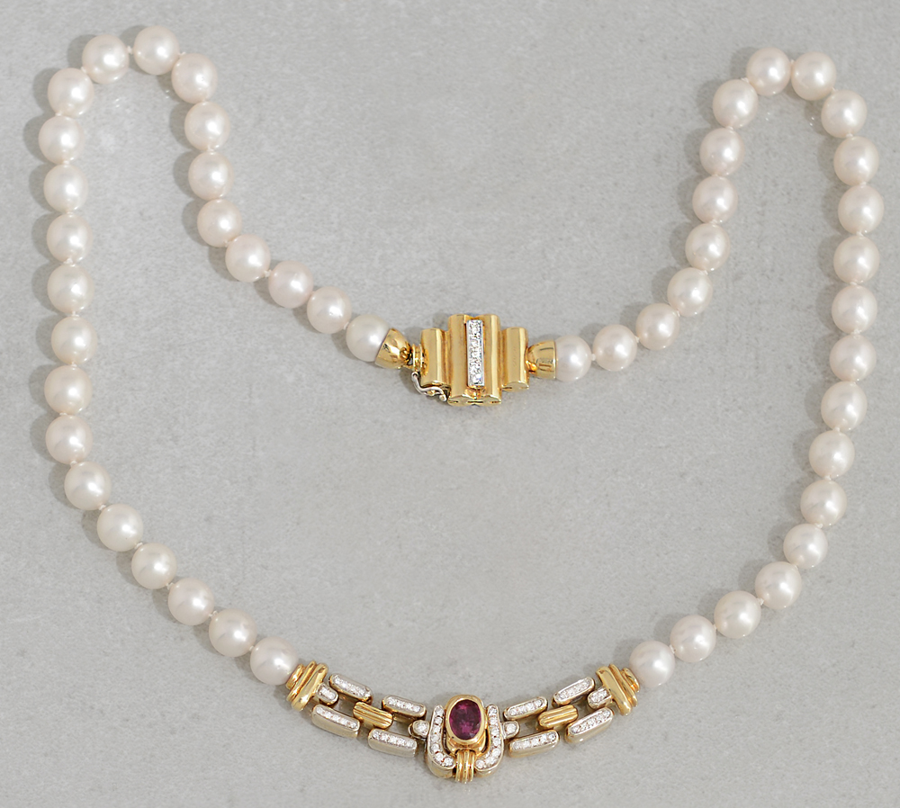 COLLANA DI DAMIANI COLLEZIONE "ASAYO". Ad un filo di perle coltivate Giappone di mm 8/8,5 ca. con chiusura e centrale in oro giallo e bianco 18 kt, rubino taglio ovale di cts. 1,20 ca. entro castone sagomato e ribattuto, diamanti taglio brillante per tot. cts. 1,50 ca.