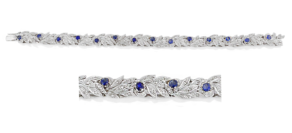BRACCIALE ANNI '60 CA. In oro bianco 18 kt maglia di gusto floreale con decori in zaffiri taglio rotondo per tot. cts. 3,00 ca. e diamanti taglio huit-huit per tot. cts. 1,00 ca.