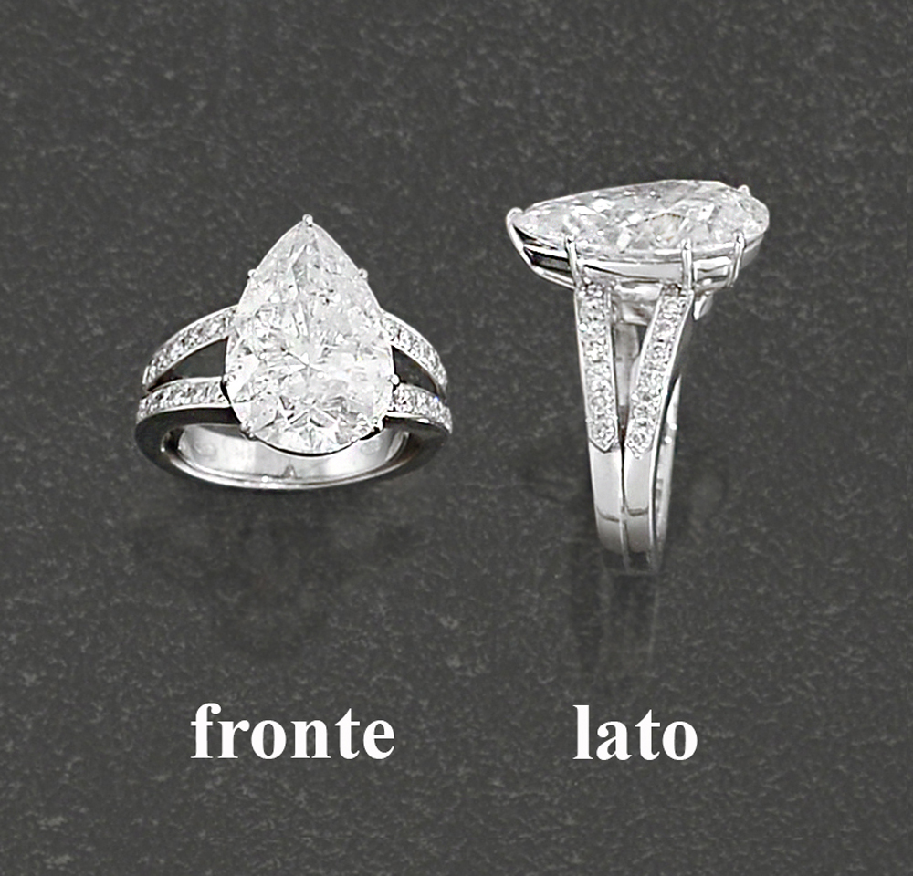 ANELLO. In oro bianco 18 kt centrato da diamante taglio goccia di cts. 8,70 ca. (prob. colore G/H purezza P1) entro decori in diamanti taglio brillante per tot. cts. 0,50 ca.