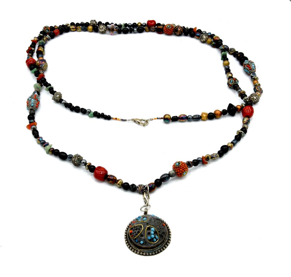 LUNGA COLLANA CON SFERE SFACCETTATE ALTERNATE DA PIETRE DURE E PENDENTE