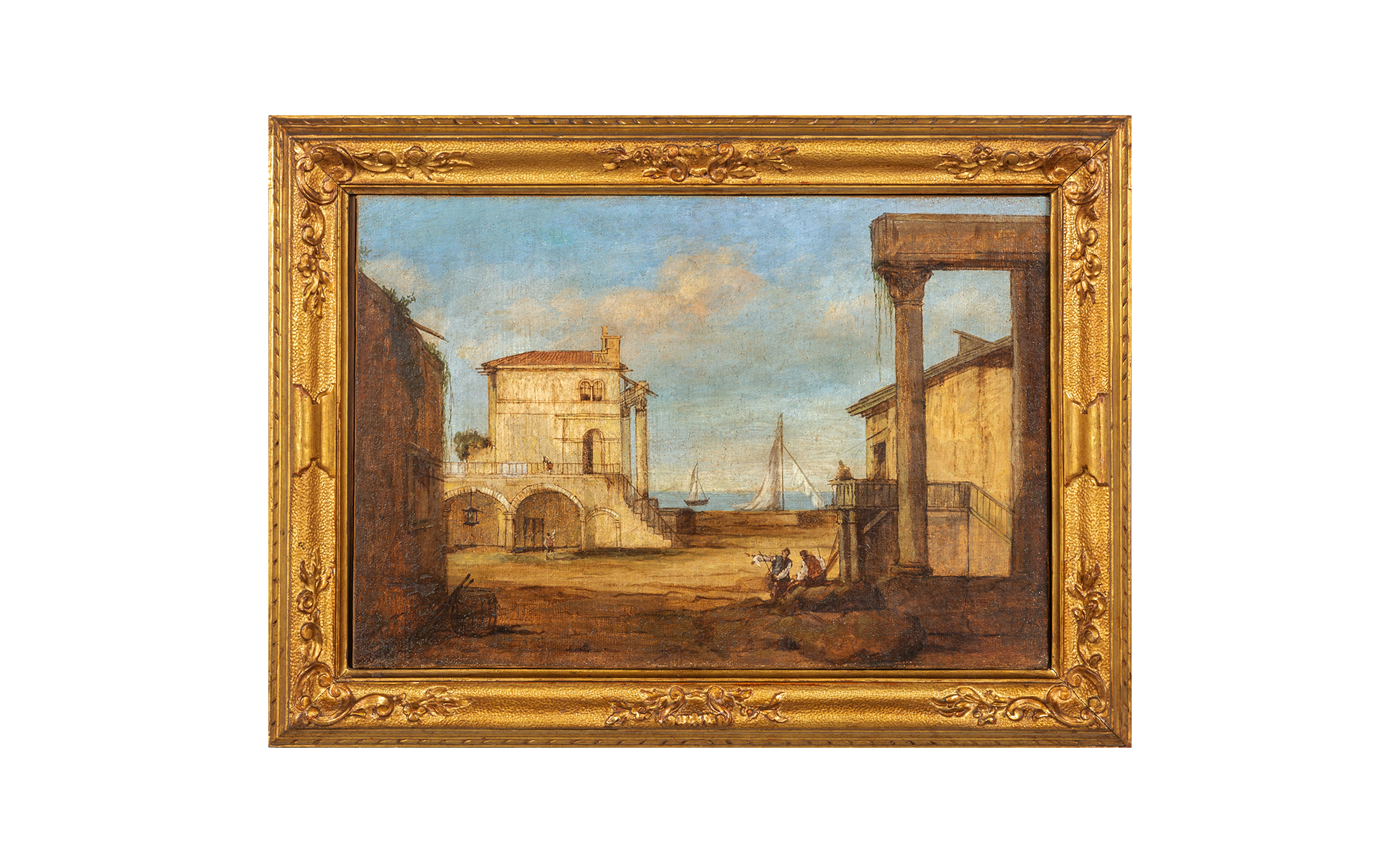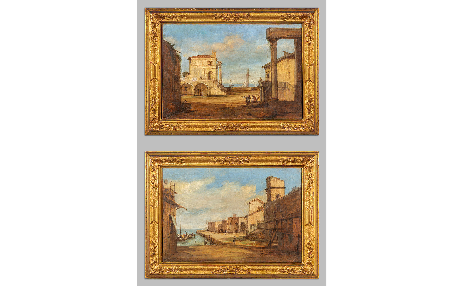 Scuola veneta II metà sec.XVIII (Giacomo Guardi) 'Paesaggi di laguna animati con figure e barche' coppia di olii