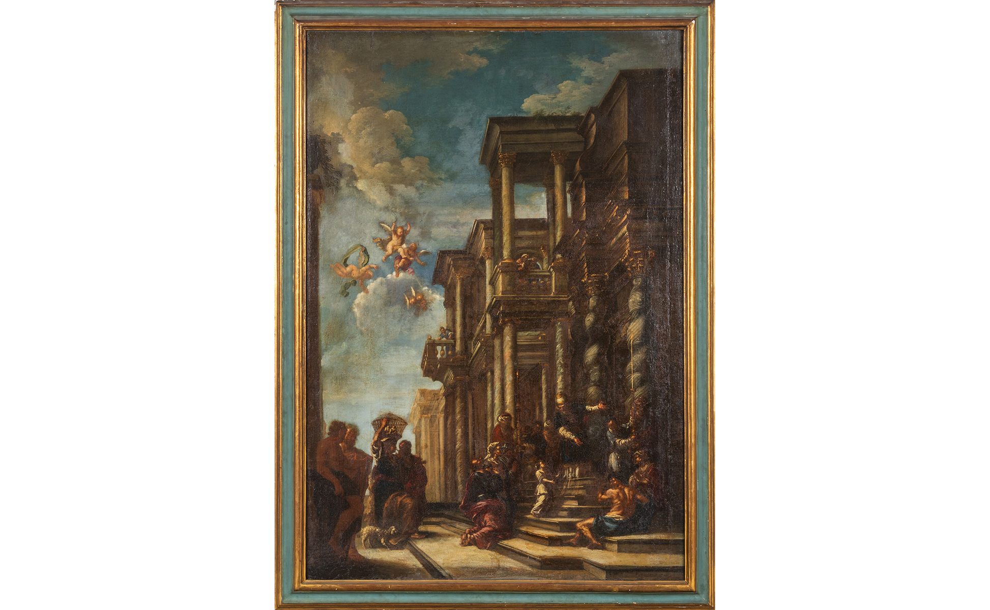 L'episodio biblico qui illustrato è quello della presentazione di Maria al Tempio: vediamo la piccola inginocchiata davanti al sacerdote e accolta nel grande edificio che però insieme agli altri che il pittore realizza in ravvicinata sequenza prospettiva è il vero protagonista della scena. Le figure quasi spariscono a confronto dell'eloquente monumentalità di questi palazzi con colonne terrazze aggetti. In un mix di fantasia e realismo immaginazione e fedeltà al vero il Benso restituisce su questa tela scenografica uno scorcio di città che a Genova è familiare anche se non può dirsi realmente riconoscibile.