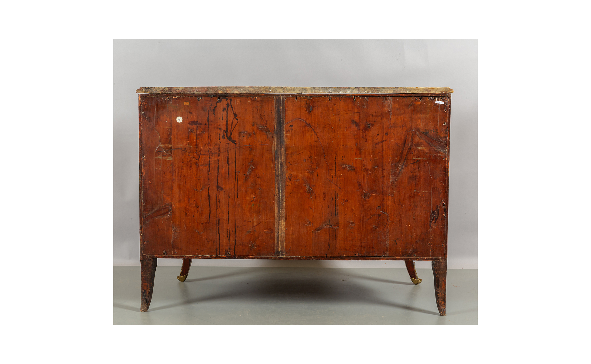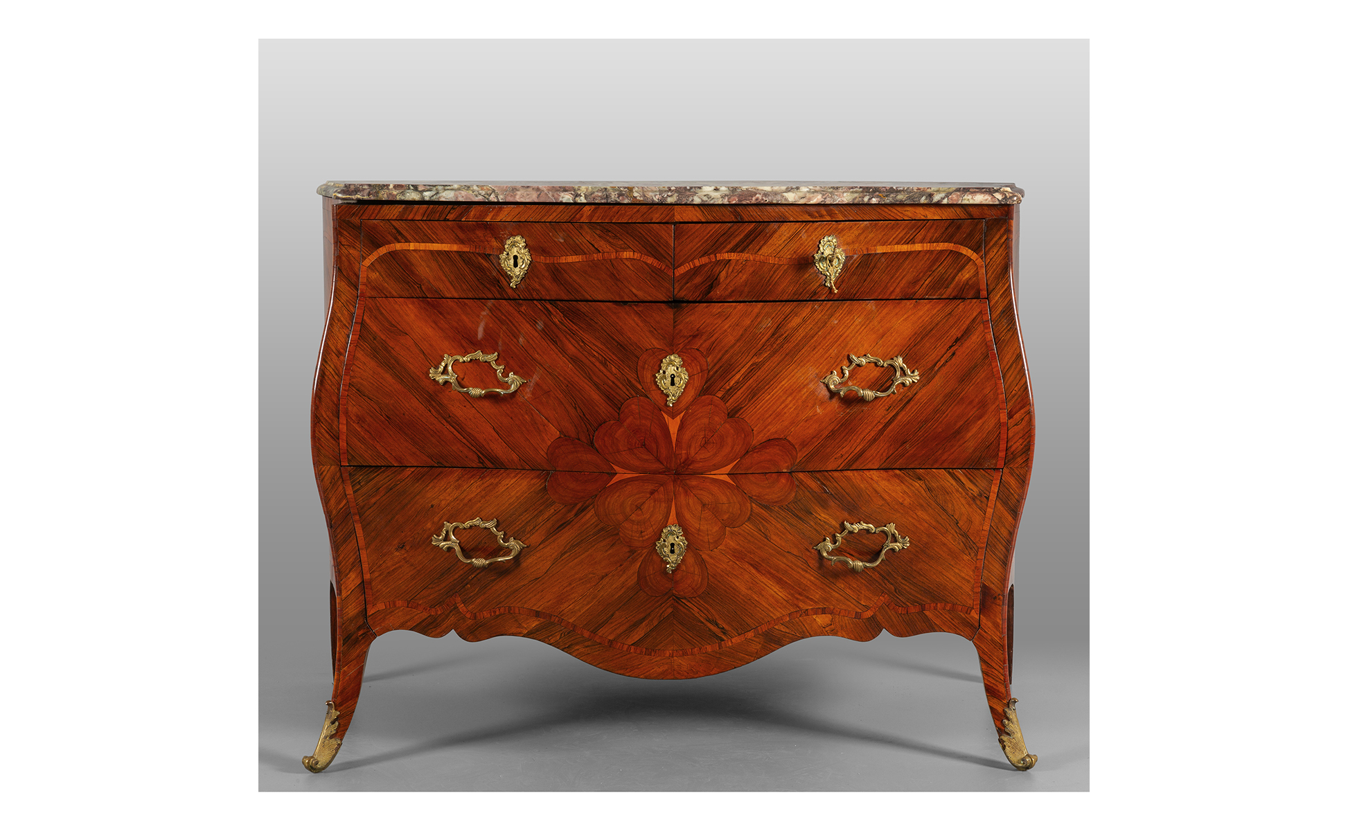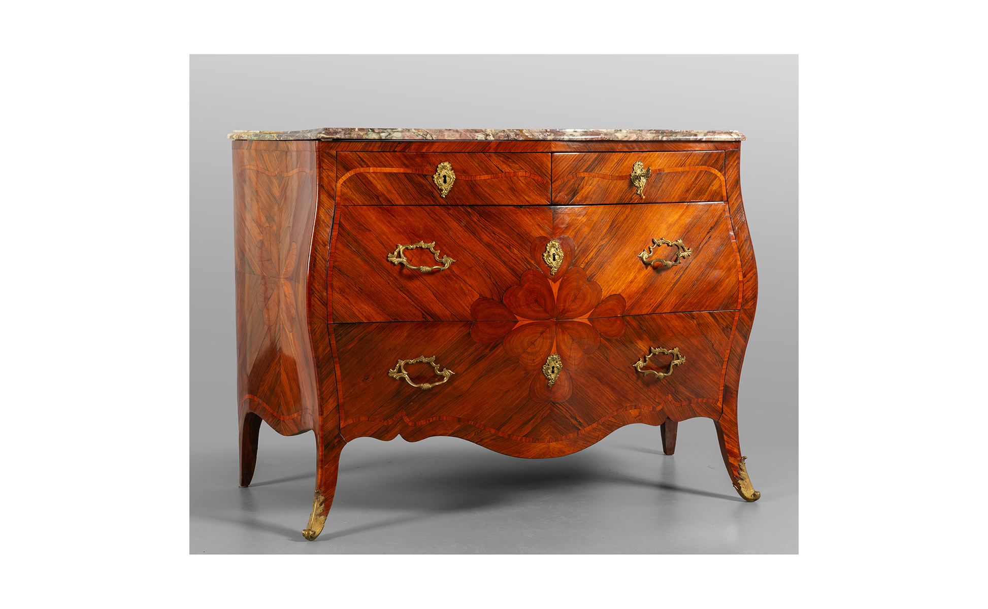 Comò Luigi XV a due cassetti grandi più due piccoli lastronato in palissandro e legno di rosa intarsiato con il tradizionale motivo del cuore piano in marmo fior di pesco Genova metà sec.XVIII
