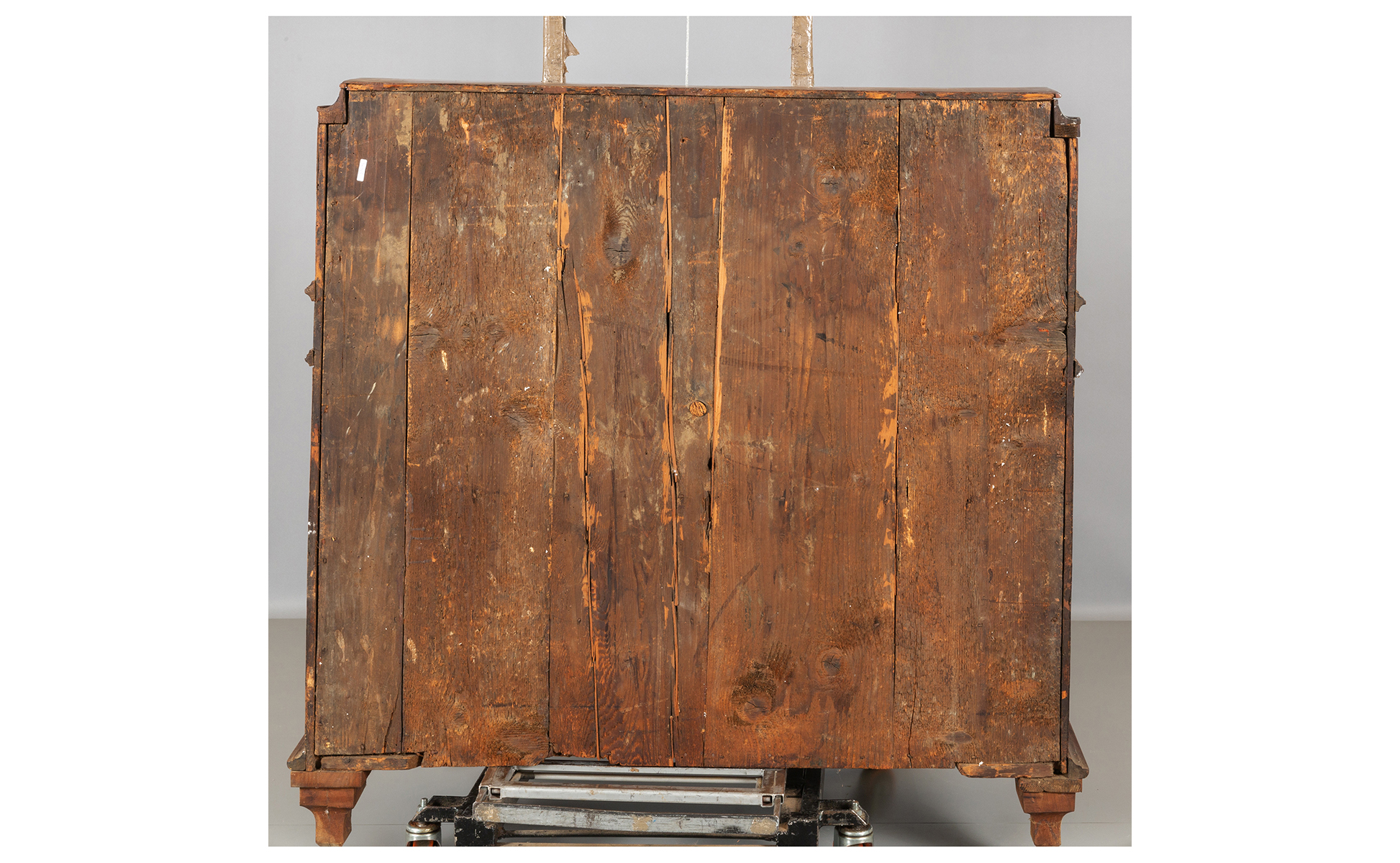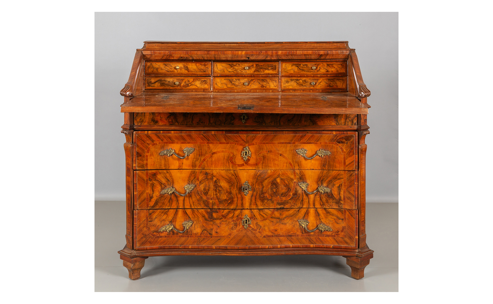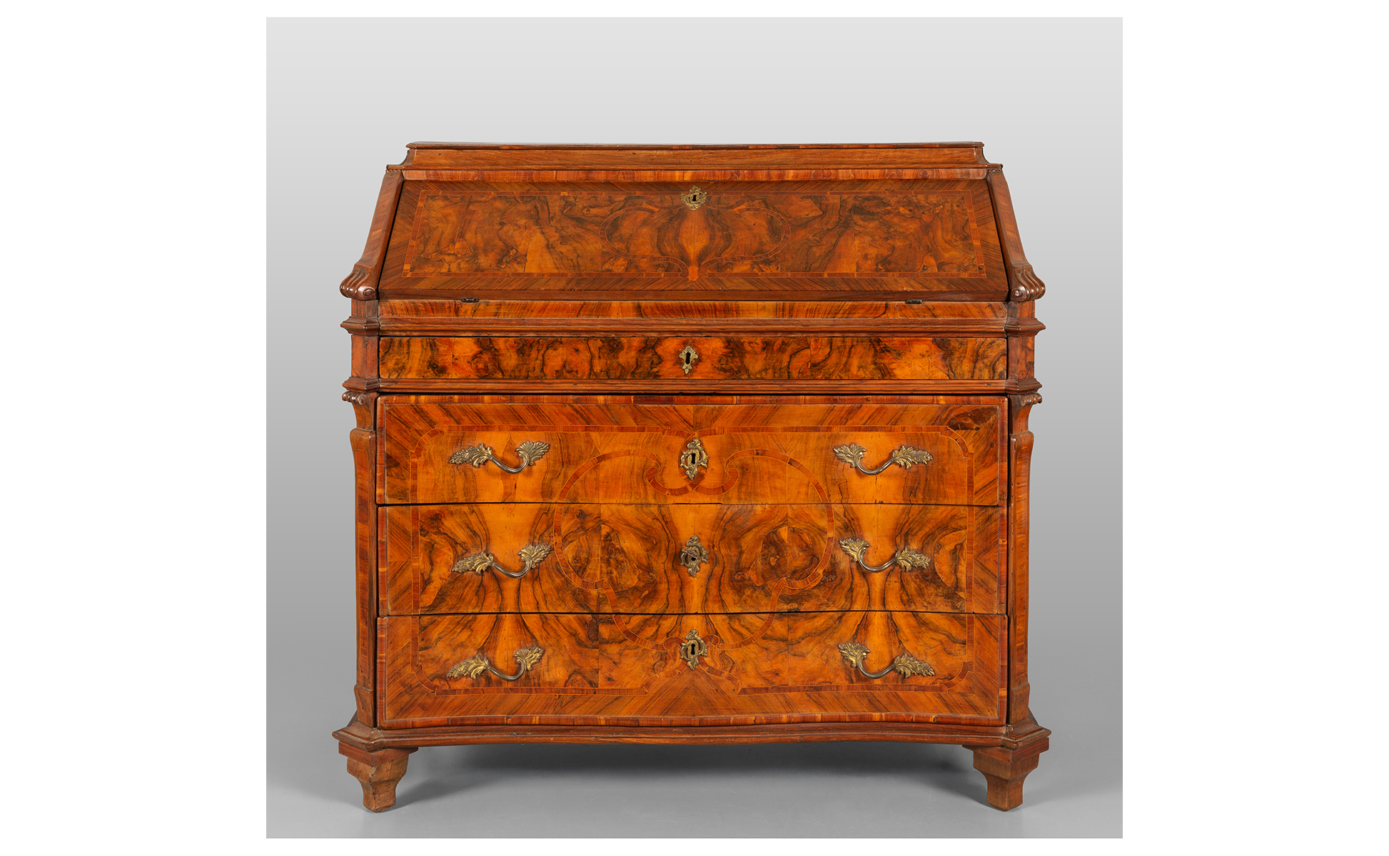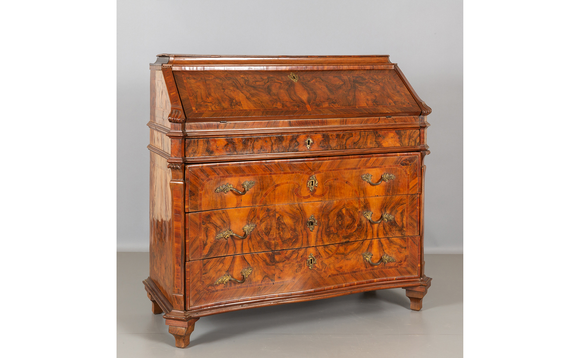 Ribalta Luigi XIV movimentata sul fronte tre cassetti e calatoia lastronata in noce e radica di noce Lombardia sec.XVIII