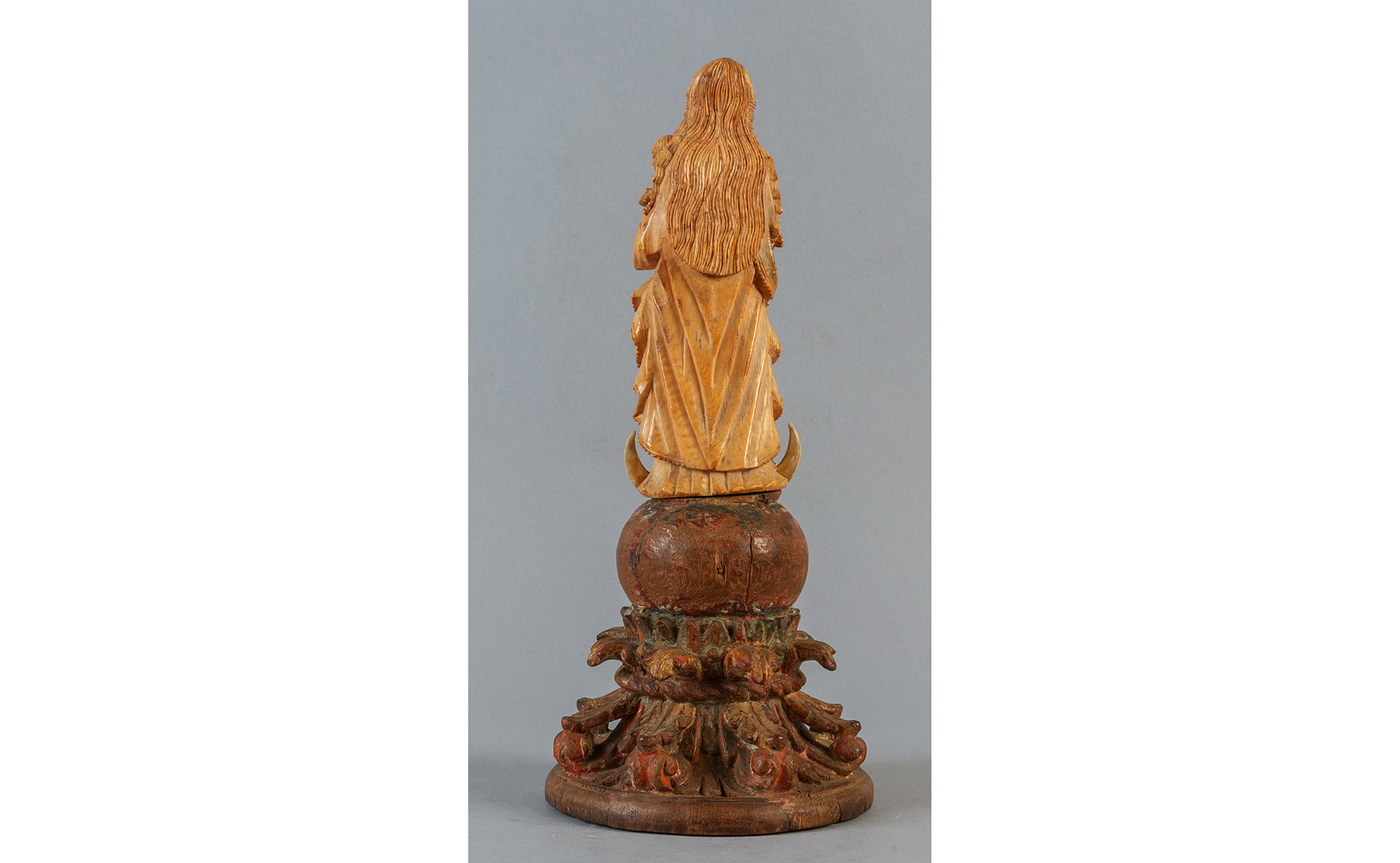 Madonna con Bambino scultura in avorio intagliato con base in legno intagliato e laccato manifattura indo portoghese sec.XVIII