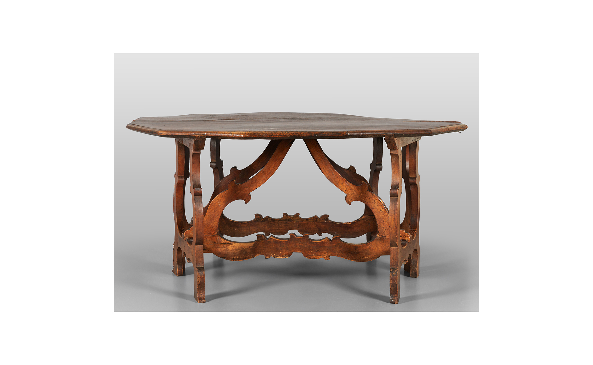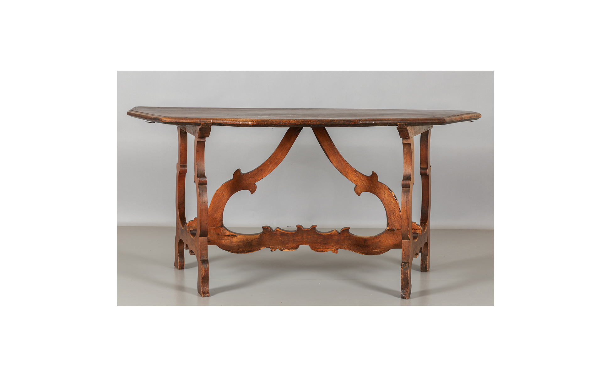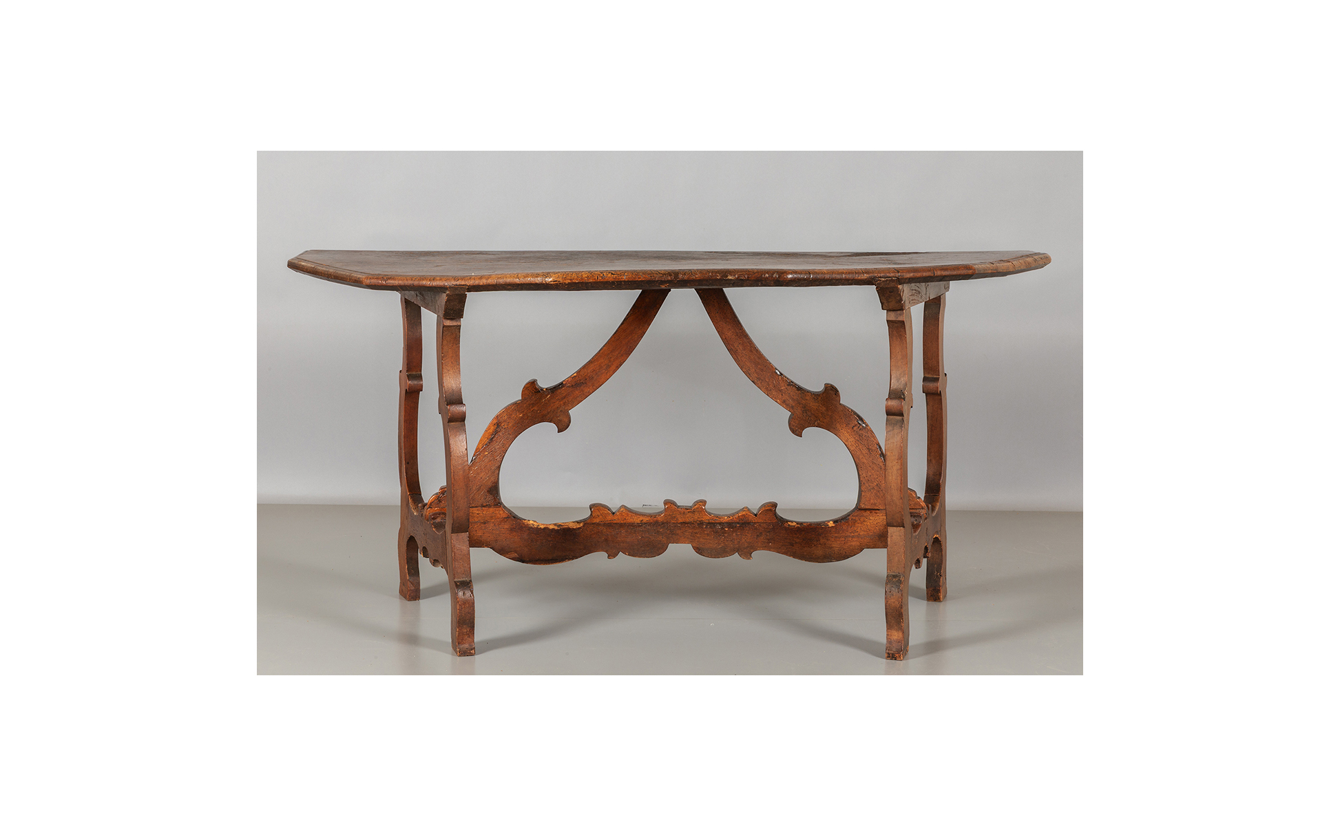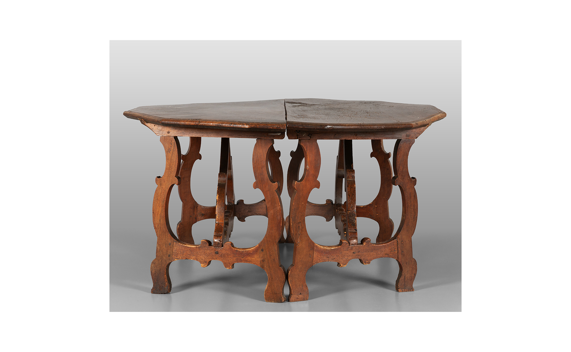 Coppia di mezzi tavoli a fratina in noce piani in un pezzo unico scantonati Centro Italia sec.XVII