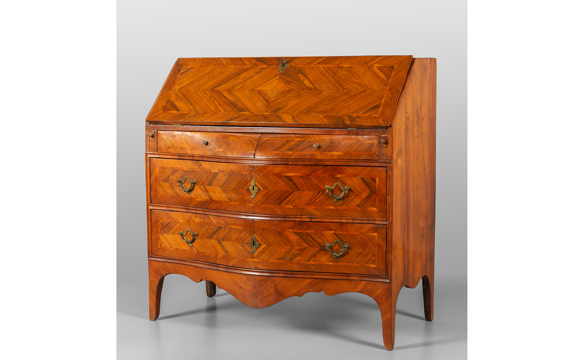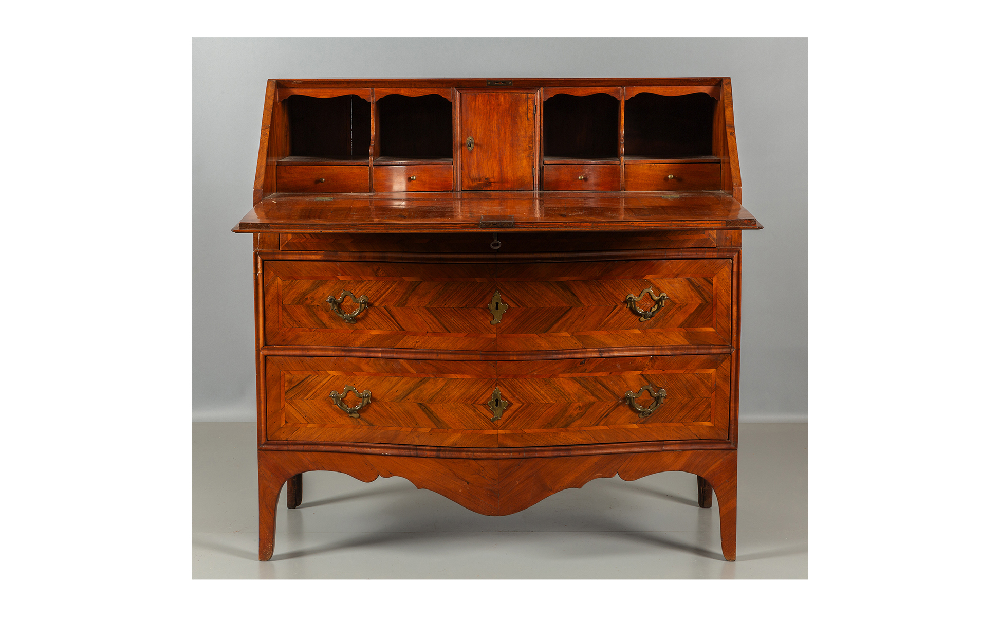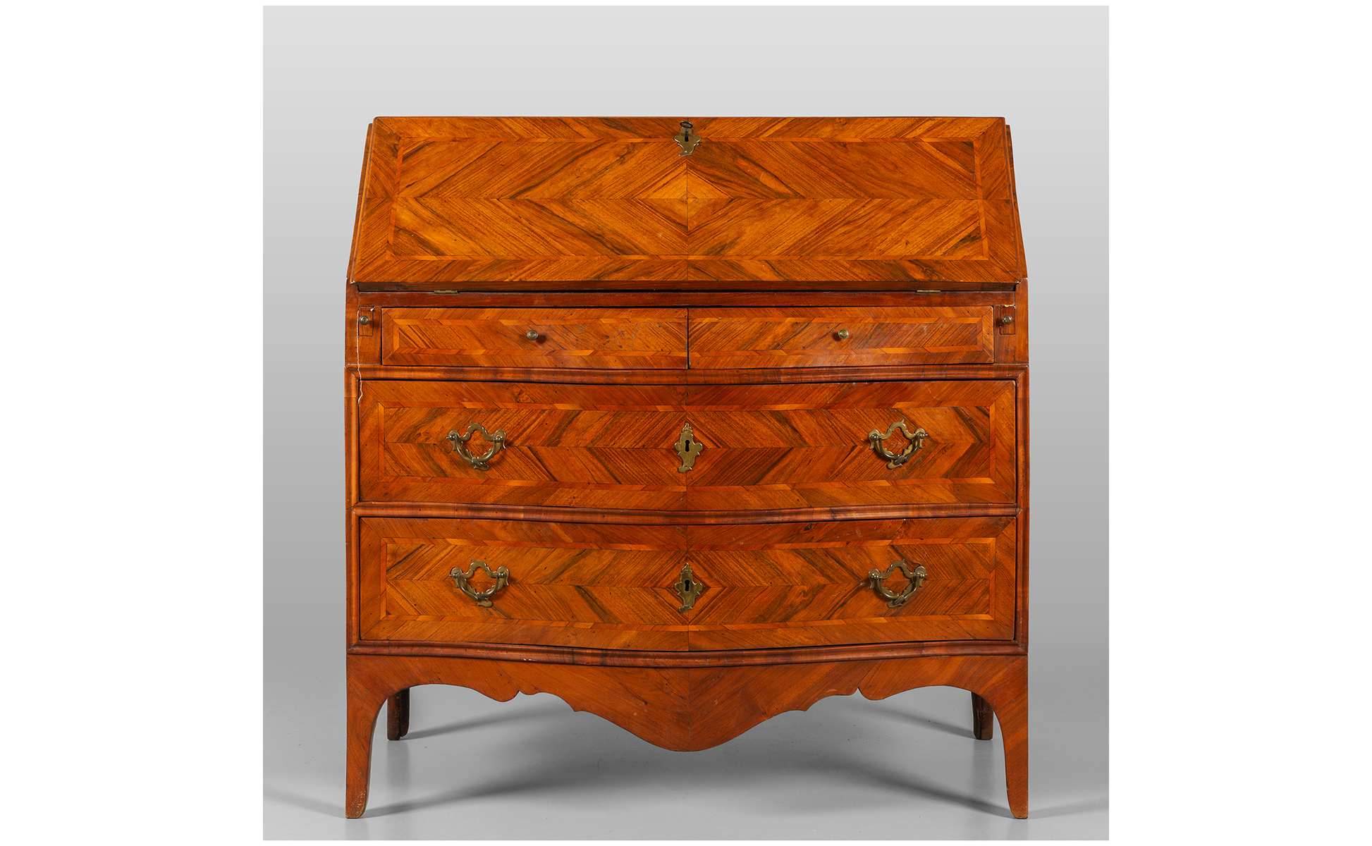 Ribalta Luigi XIV a due cassetti più due cassettini lastronata in noce e filettata in legno di rosa Genova I metà sec.XVIII