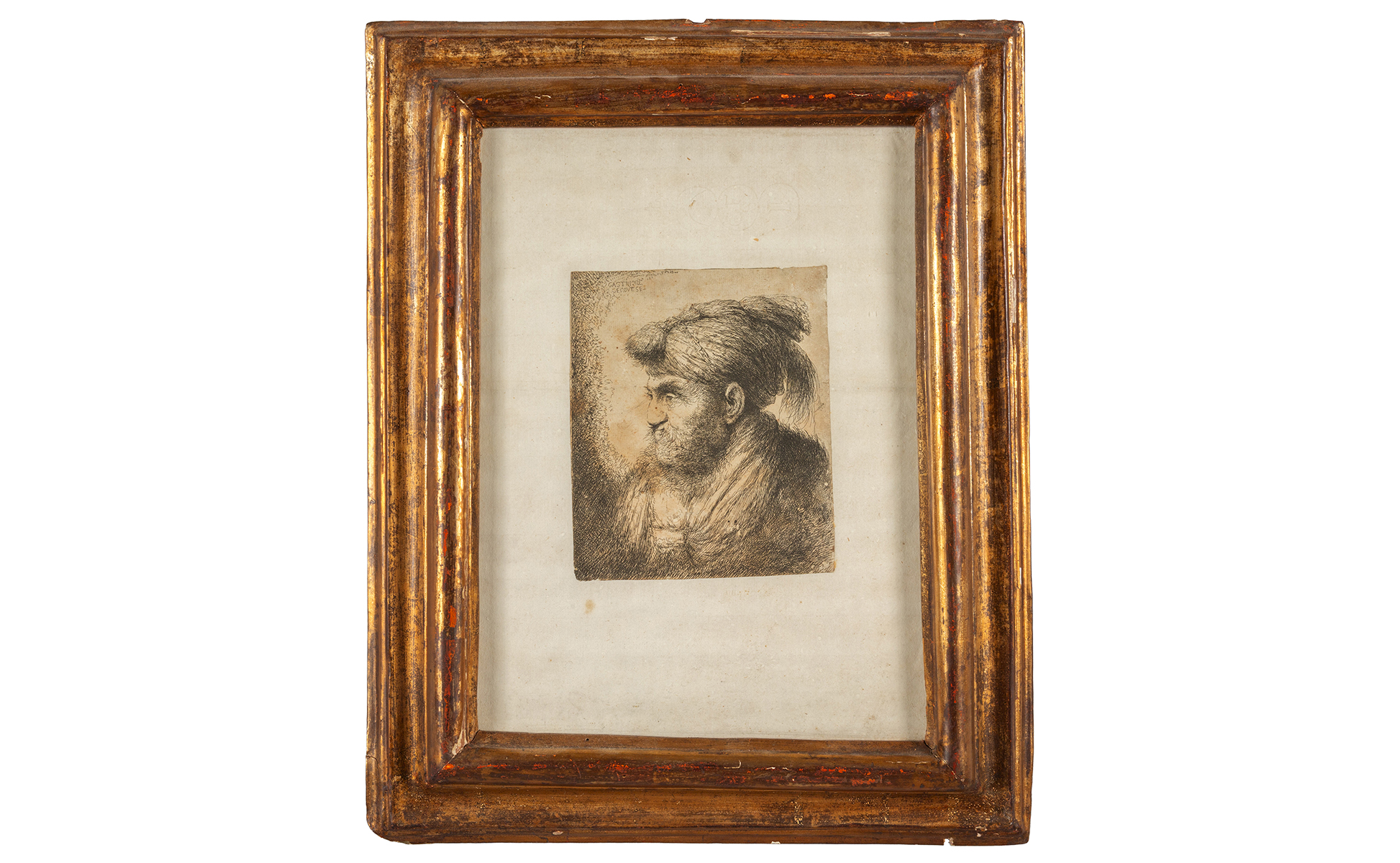 Testa di uomo anziano vestito all'orientale incisione cornice antica in legno dorato a mecca