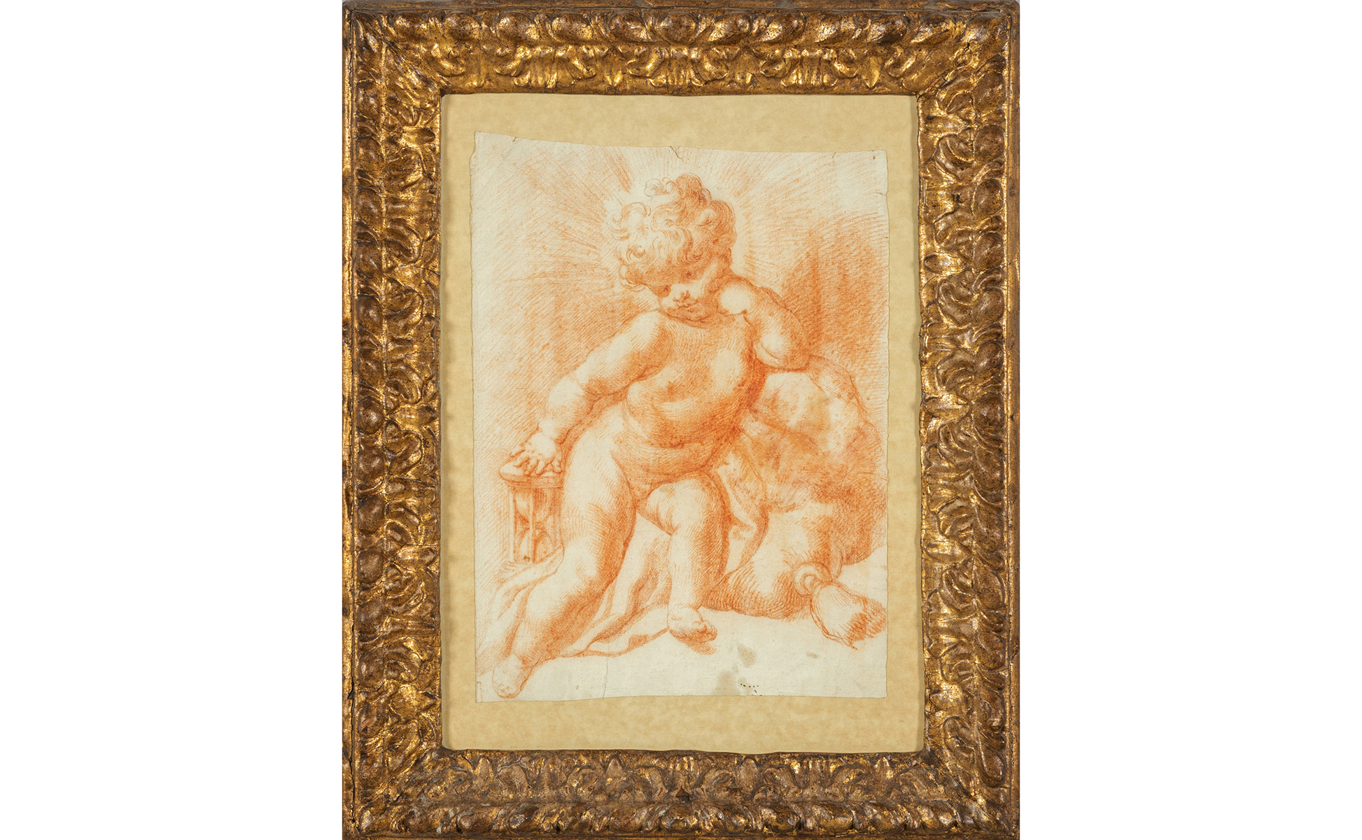 Scuola genovese sec.XVII (Domenico Piola?) 'Allegoria del tempo' disegno a sanguigna cornice in legno intagliato e dorato sec.XVII