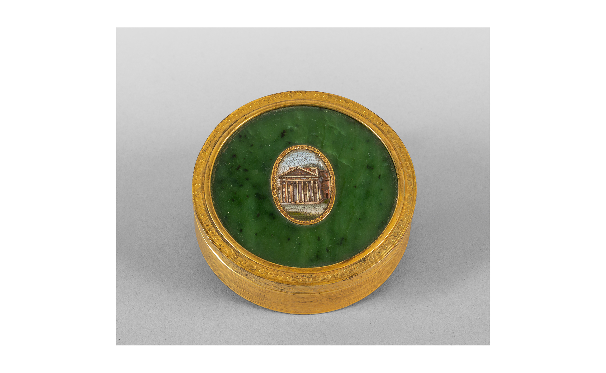 Scatola in metallo dorato coperchio in giada con al centro micromosaico sec.XIX