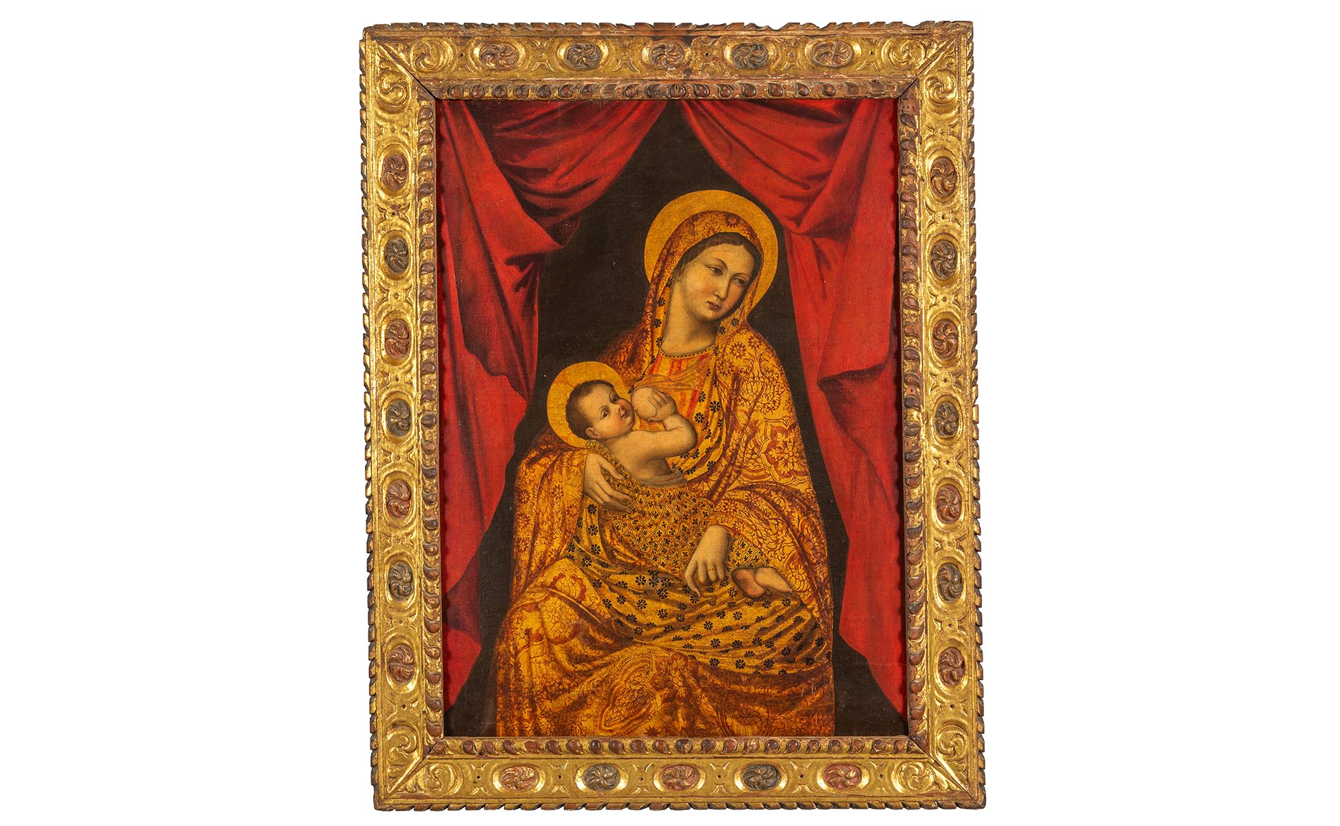 Maestro veneto cretese sec.XVII 'Madonna con Bambino' olio splendida cornice coeva in legno dorato e meccato