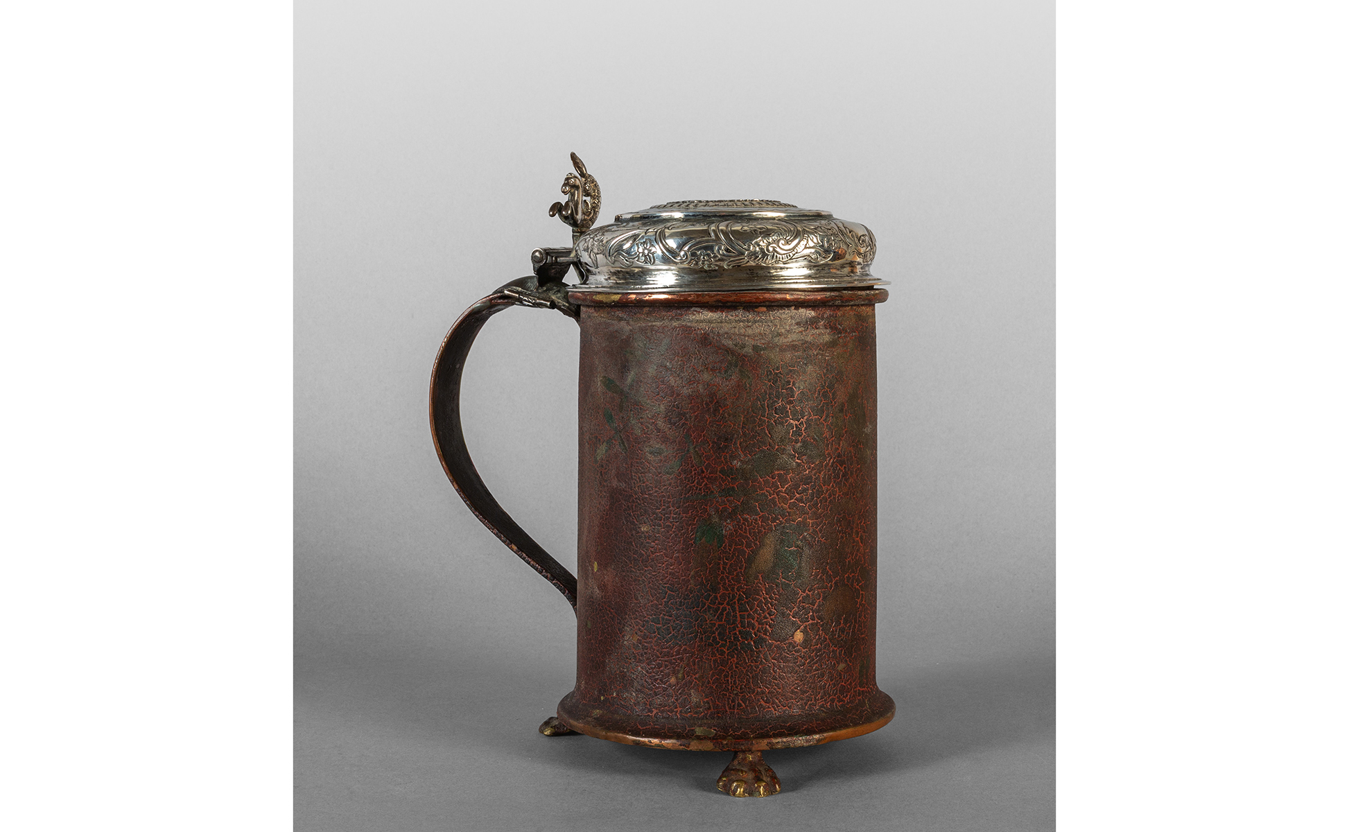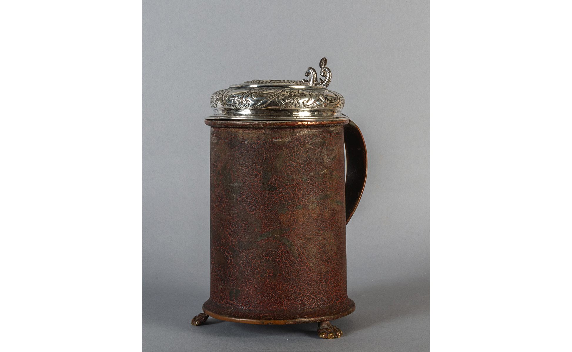 Tankard in rame dipinto con parte superiore in argento con antica moneta Oslo 1787