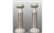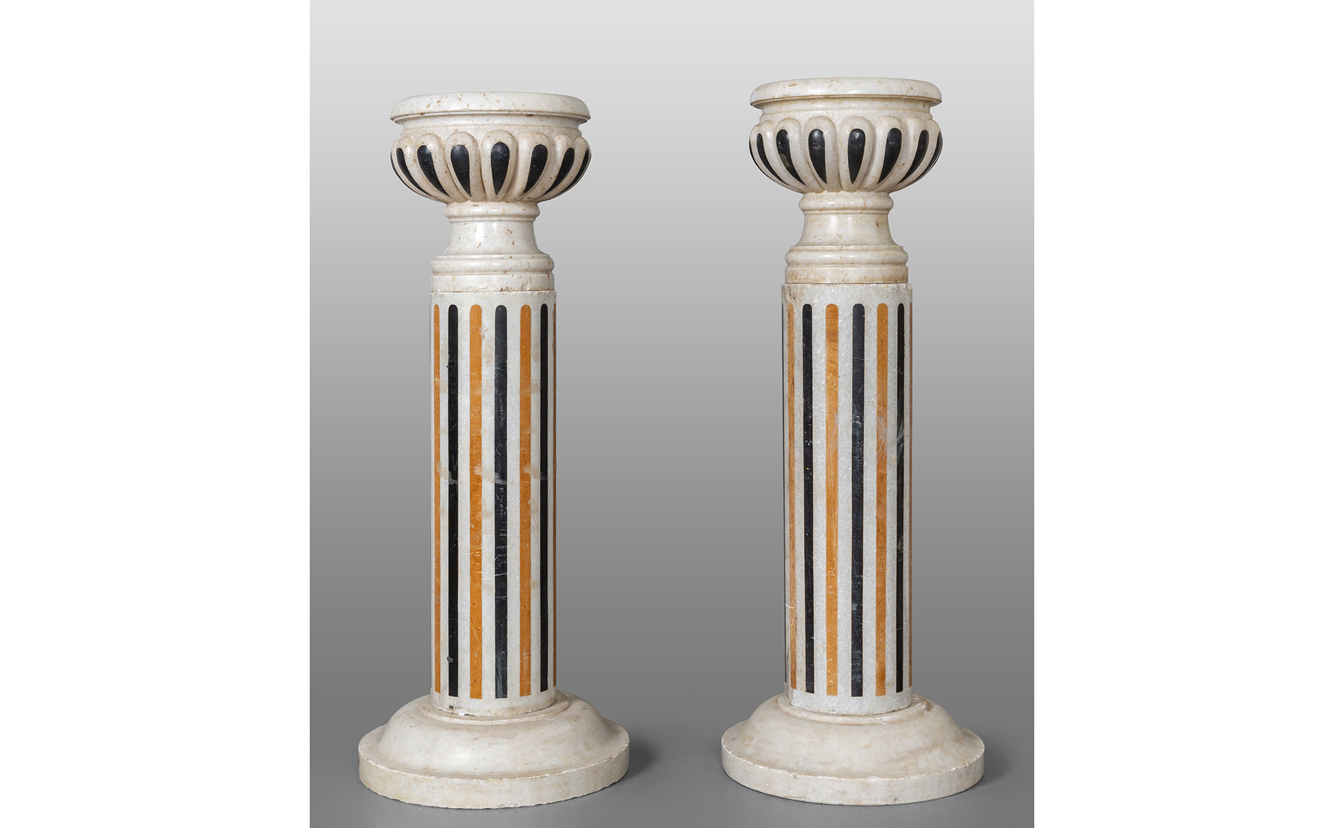 Coppia di vasi in marmo bianco con intarsi in nero del Belgio poggianti su colonne in marmo intarsiato in nero del Belgio e giallo Siena sec.XIX