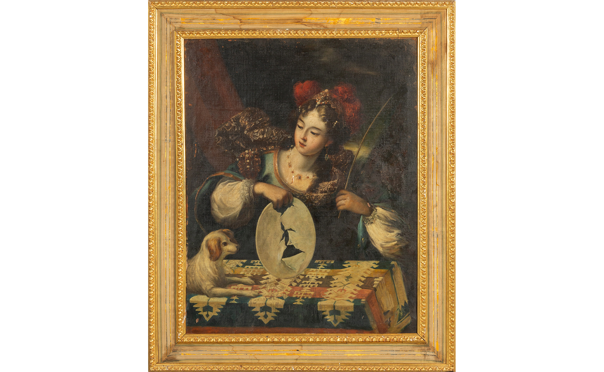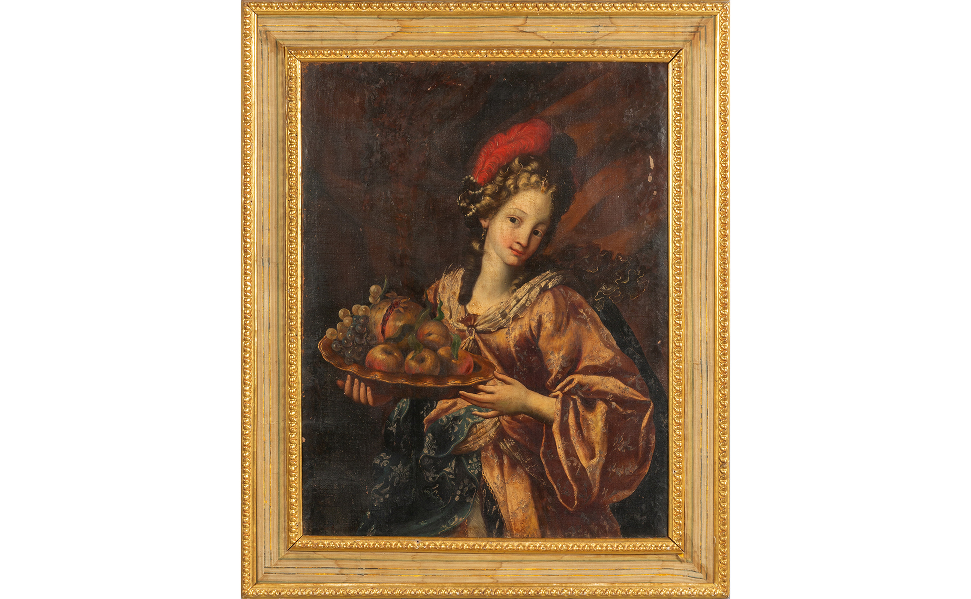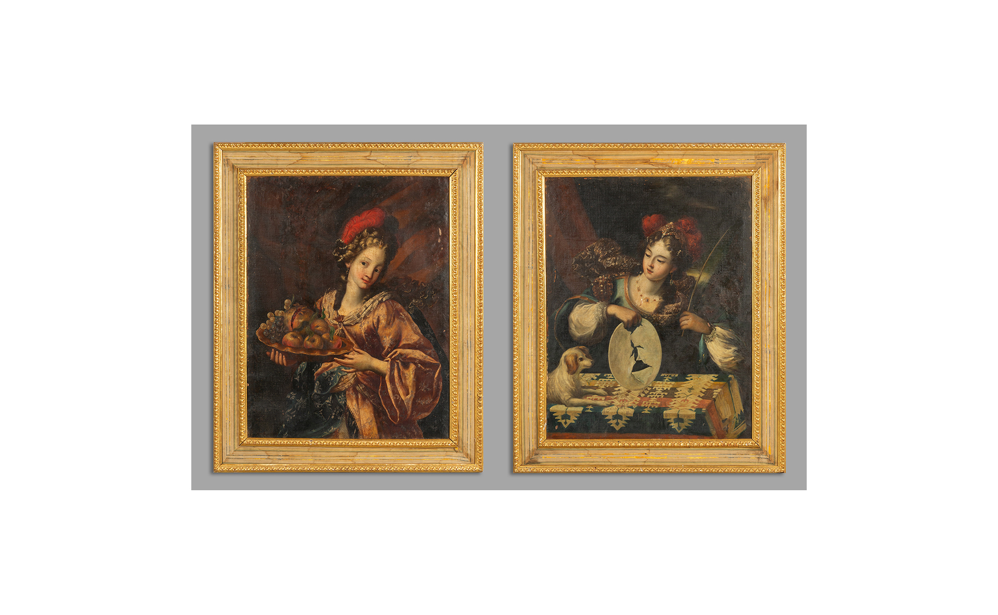 Scuola lombarda sec.XVII 'Giovani dame' coppia di olii cornici in legno dorato e stoffa