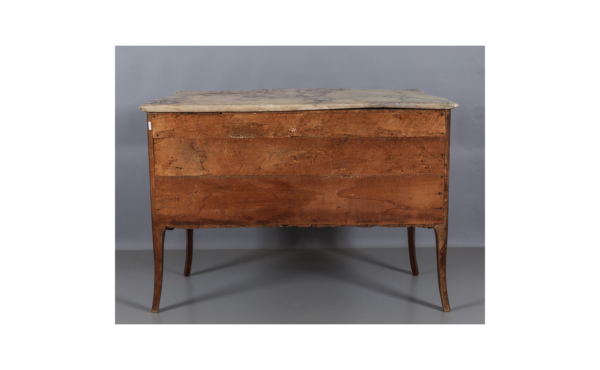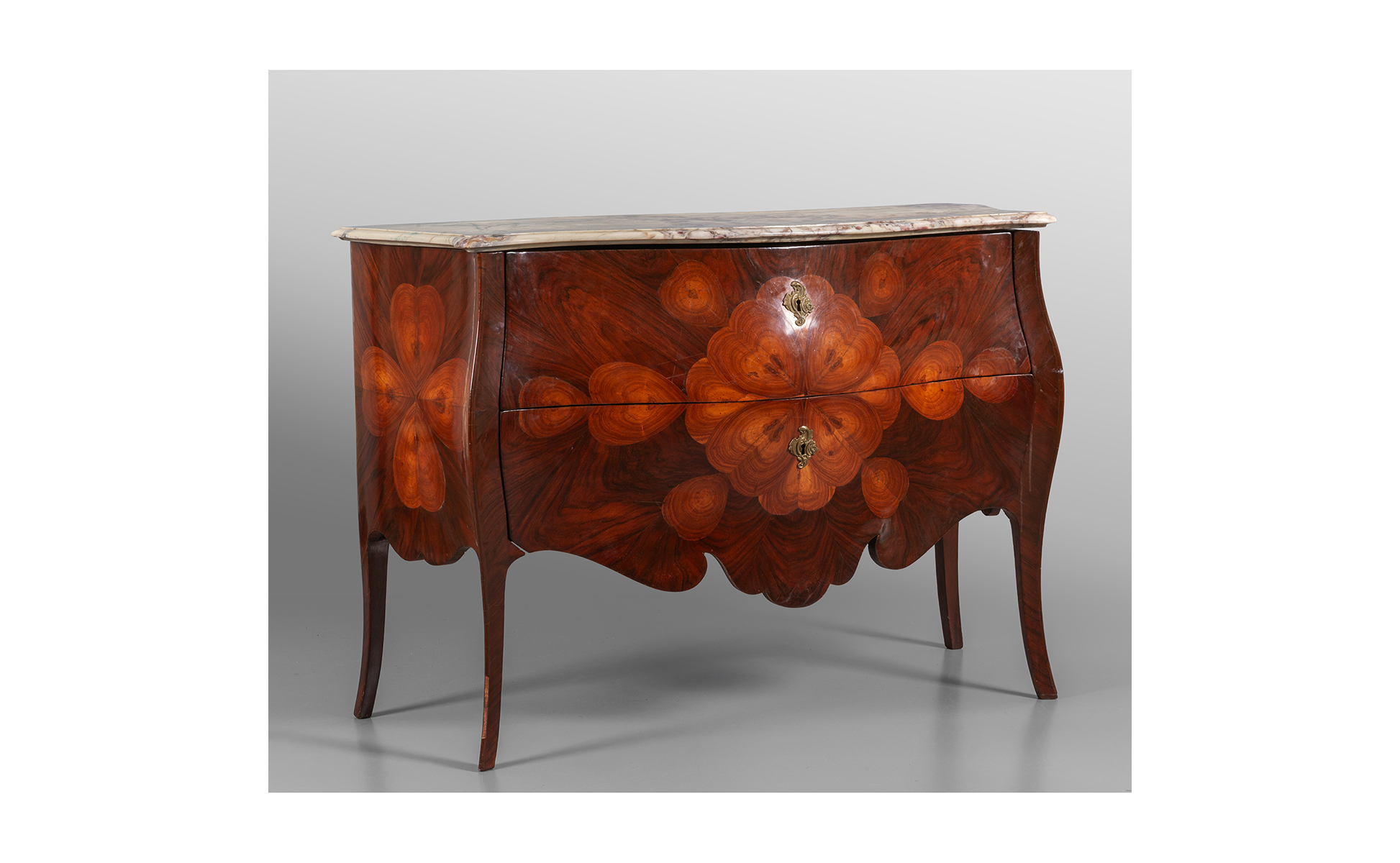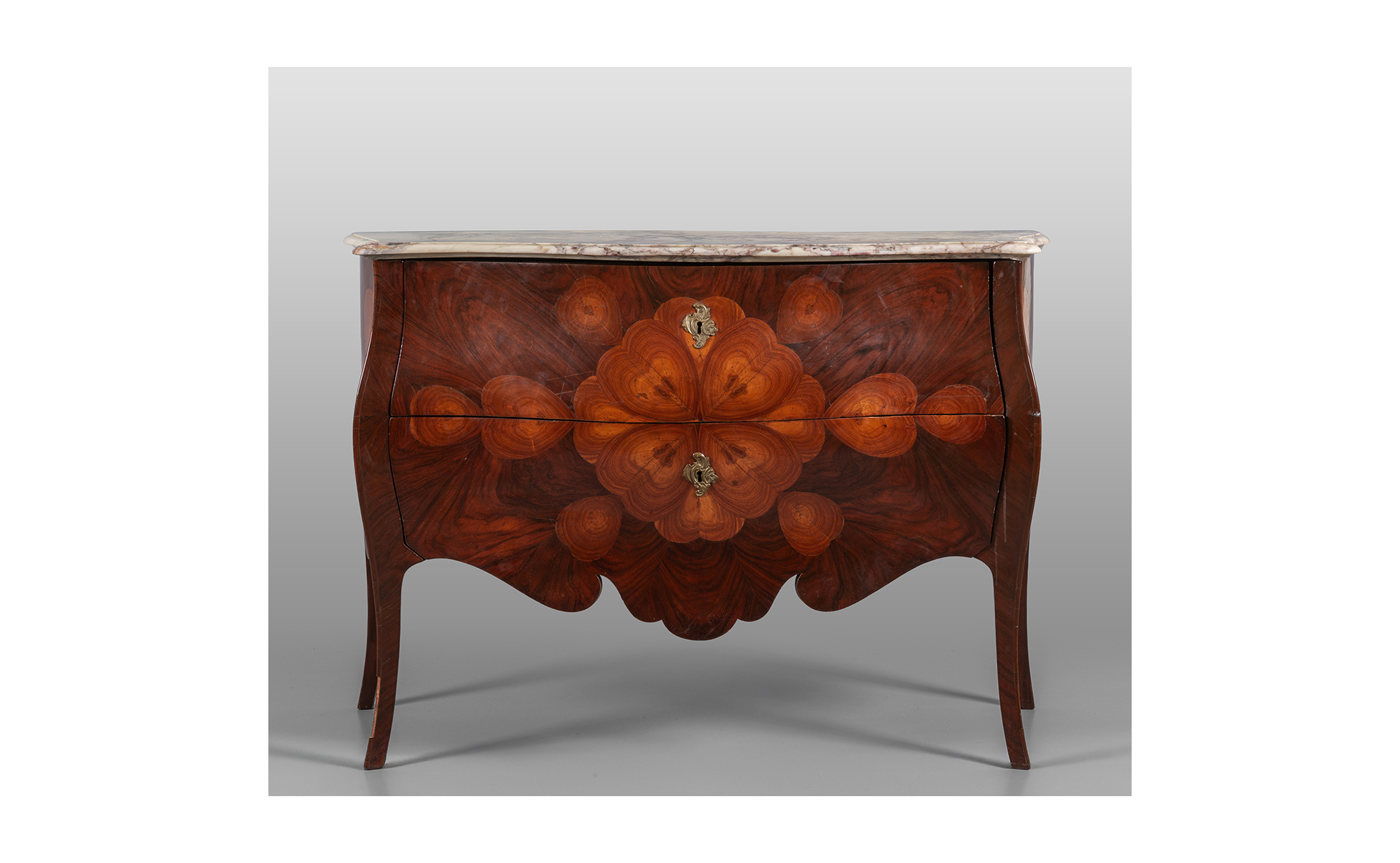 Comò Luigi XV movimentato sul fronte e sui fianchi due cassetti senza traversa lastronato ed intarsiato con il tradizionale motivo del cuore sul fronte e sui fianchi piano in marmo fior di pesco Genova metà sec.XVIII