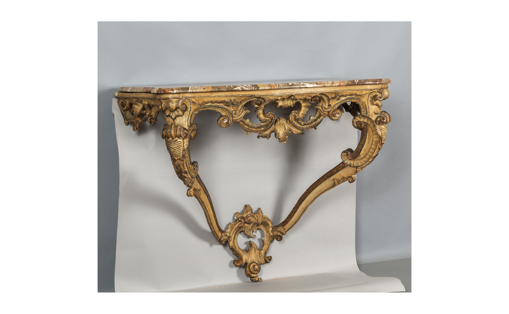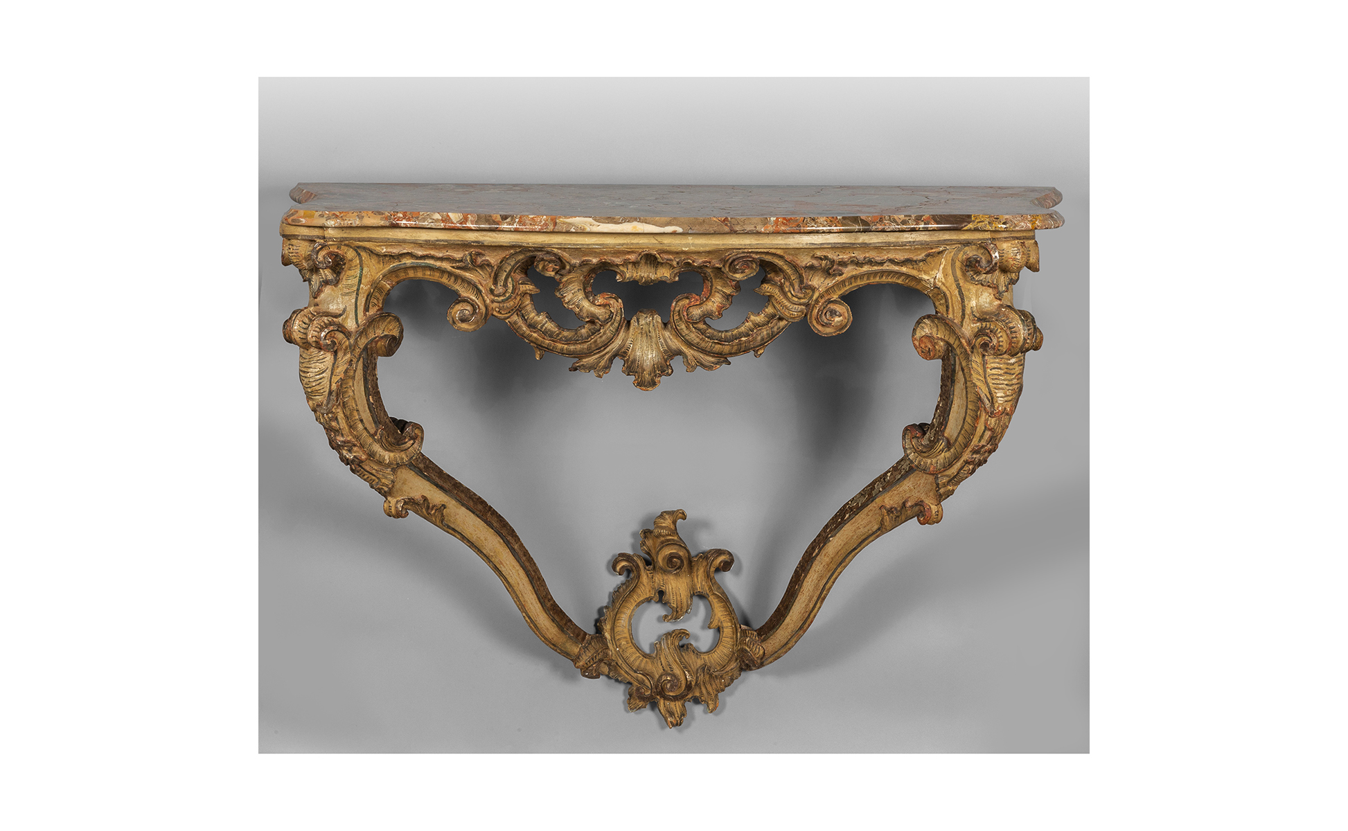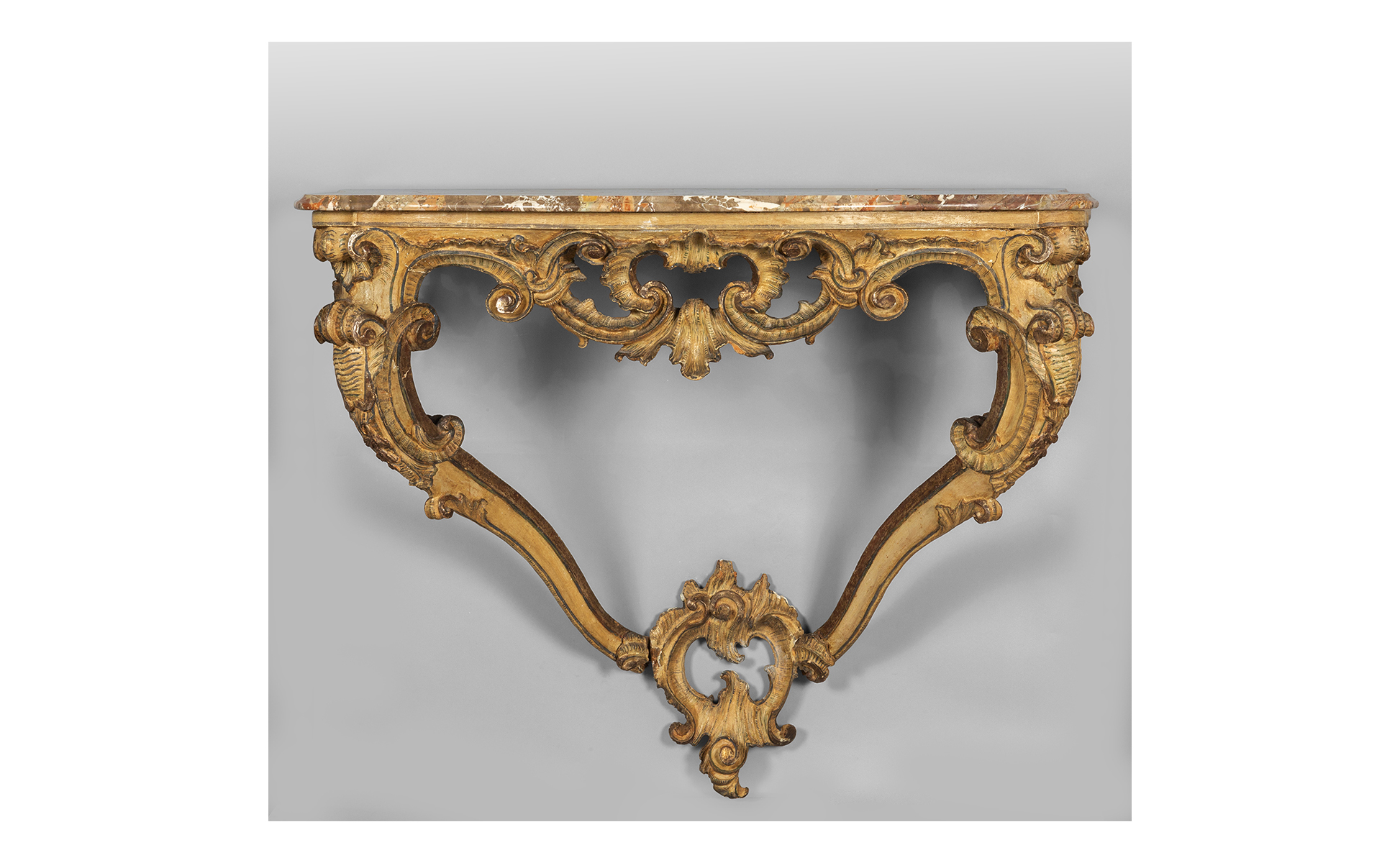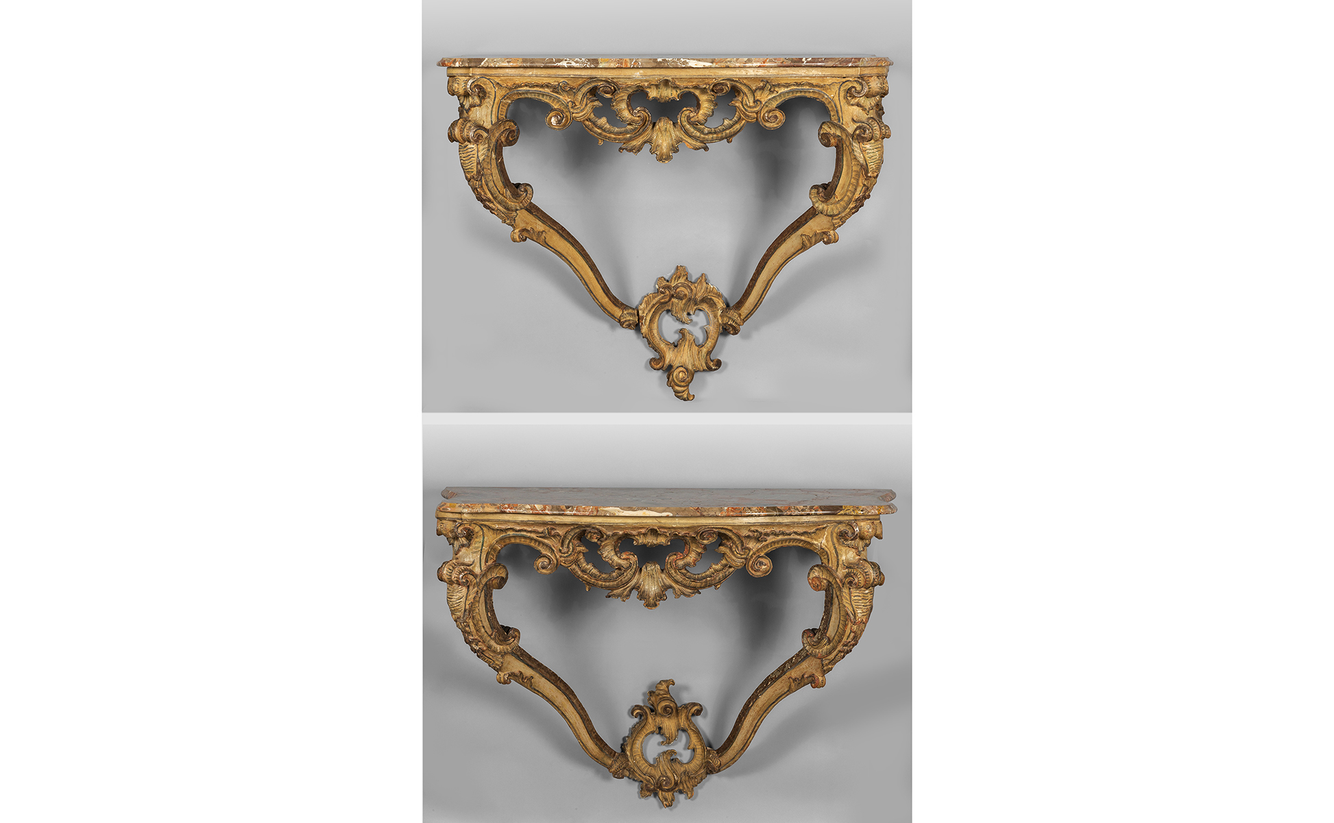 Coppia di consoles Luigi XV a goccia in legno laccato ed intagliato a motivi vegetali piani in breccia Lombardia metà sec.XVIII