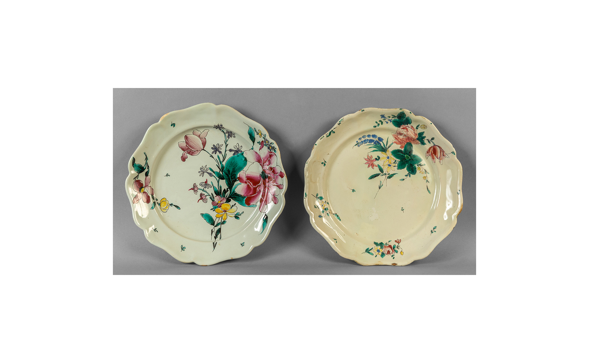 Due grandi piatti in ceramica decorati in policromia a fiori su fondo bianco uno f.to J.Boselly Savona sec.XVIII