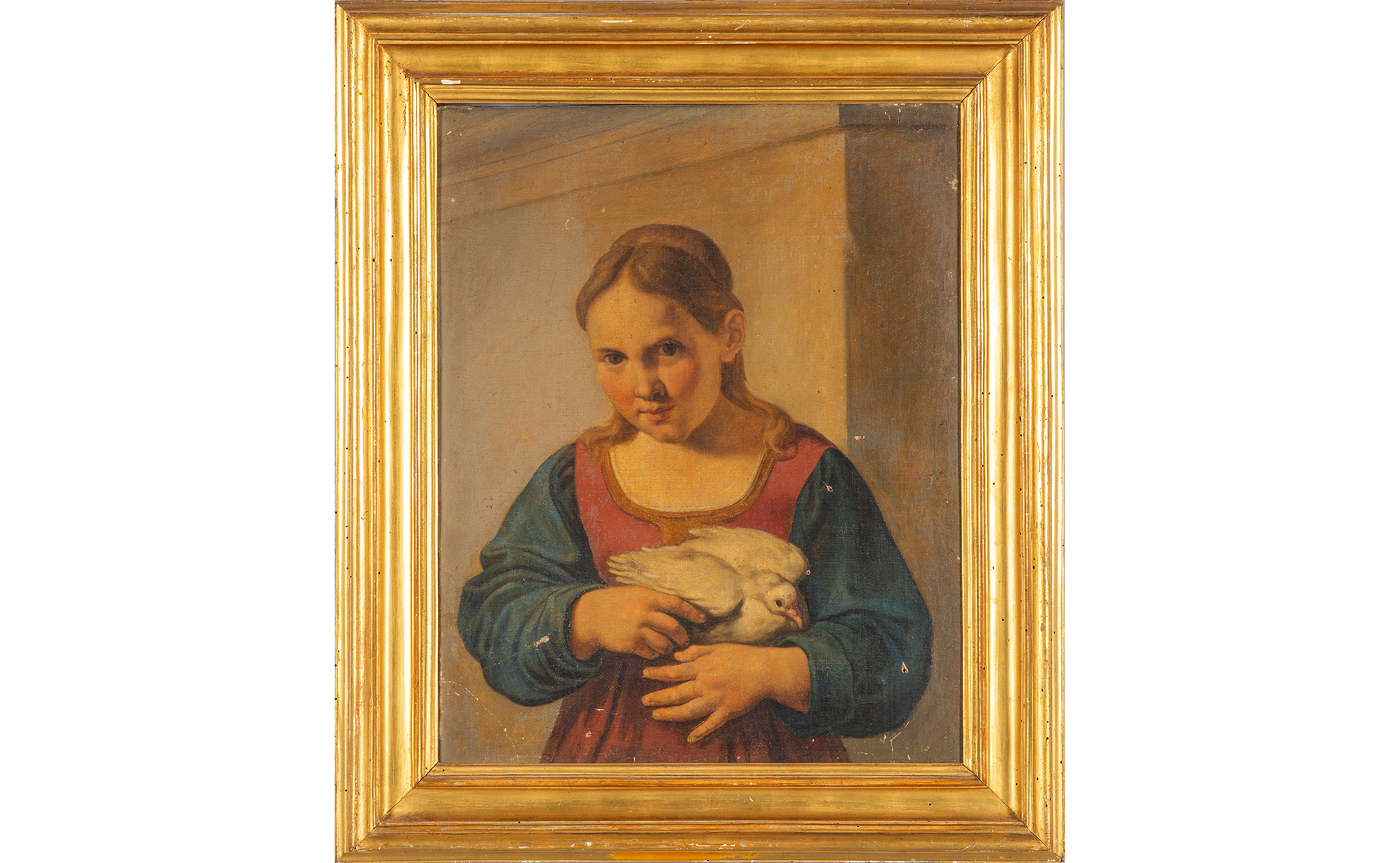 Scuola emiliana sec.XVIII 'Bambina con colomba' olio cornice a sagoma romana in legno dorato coeva
