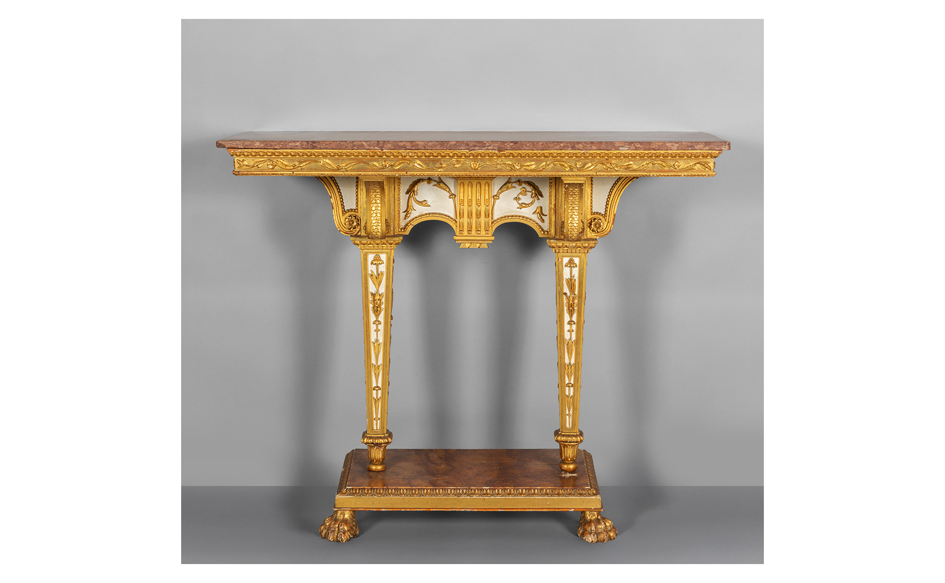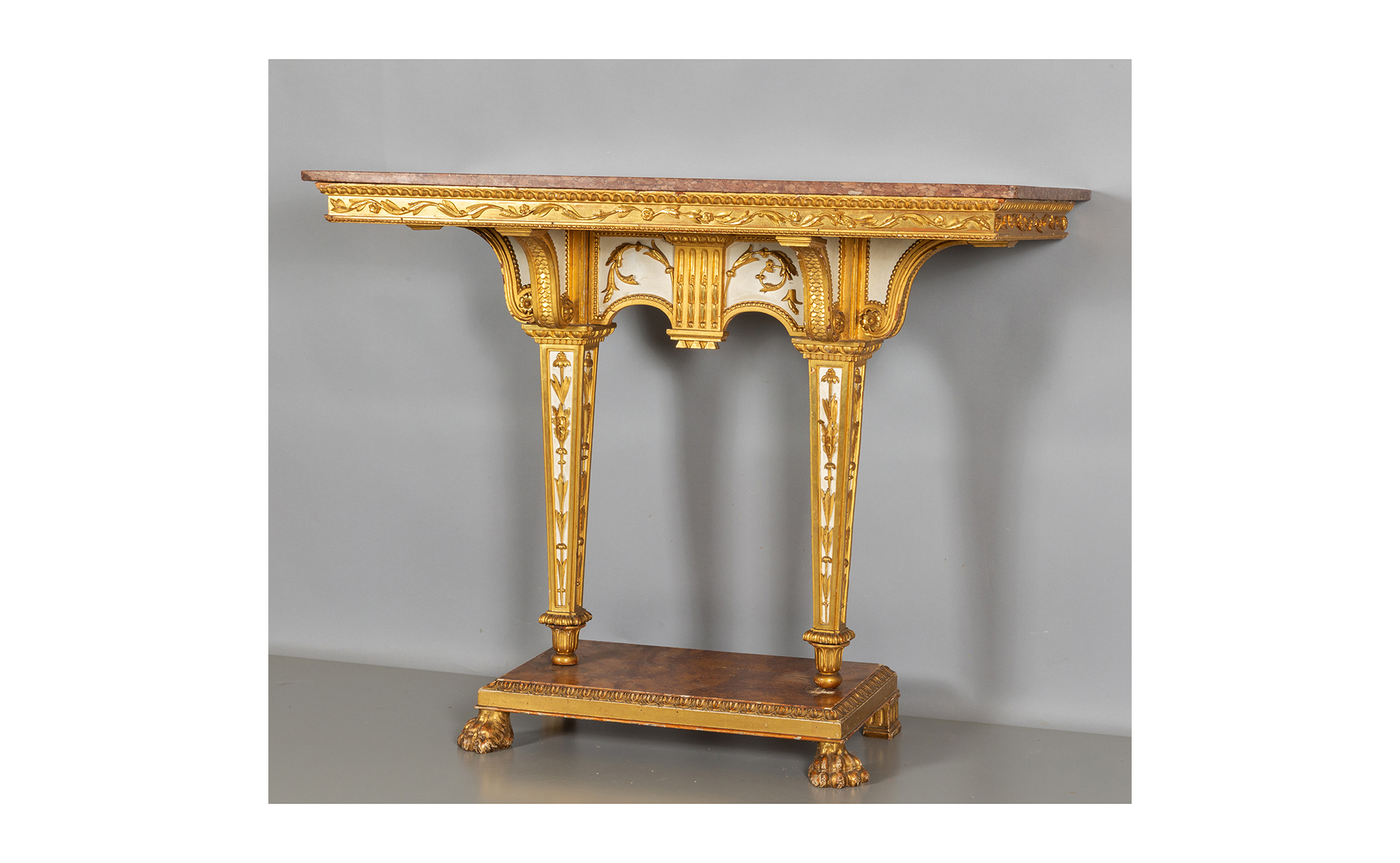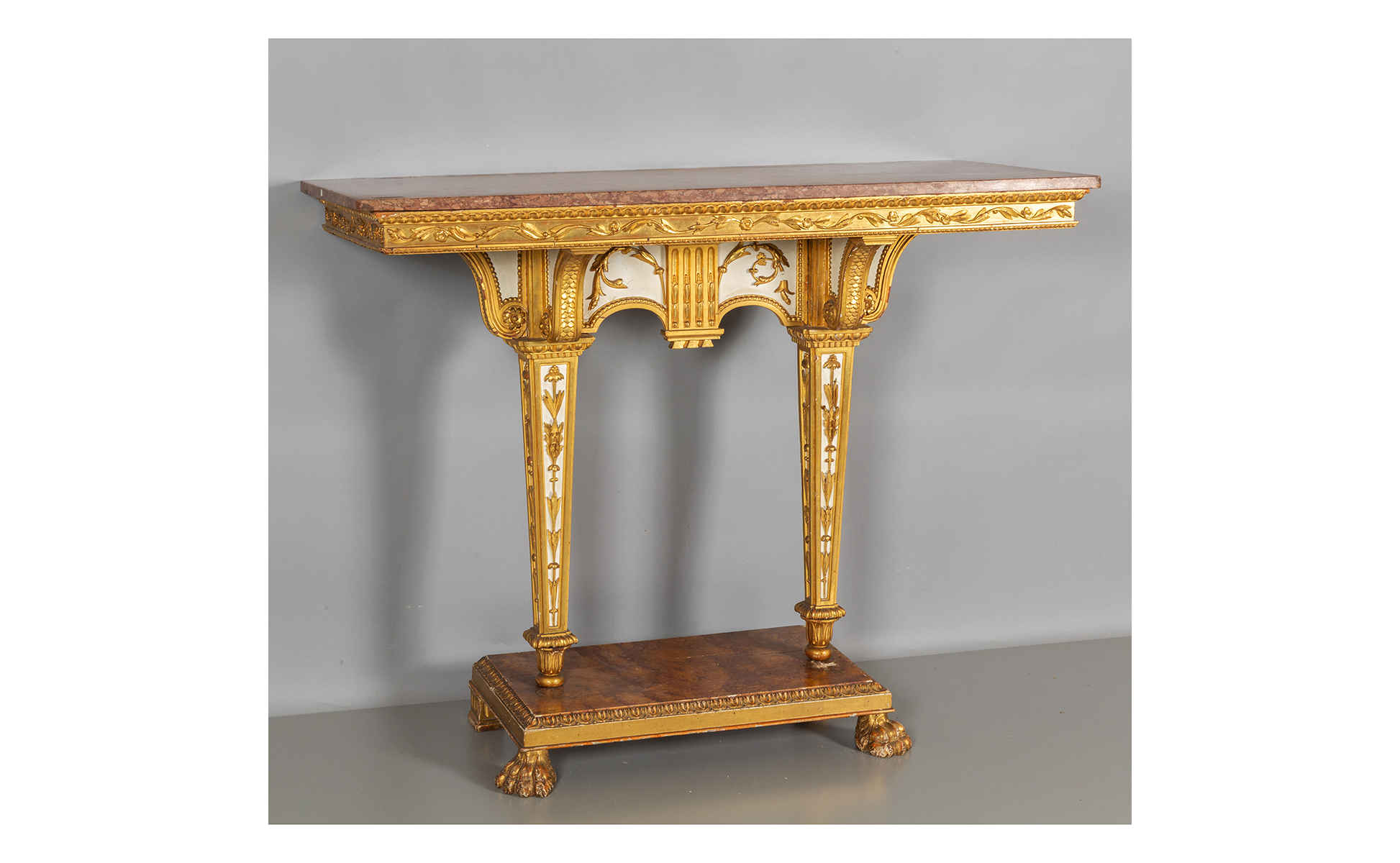 Console Luigi XVI a due gambe in legno intagliato dorato e laccato piano in marmo Genova fine sec.XVIII