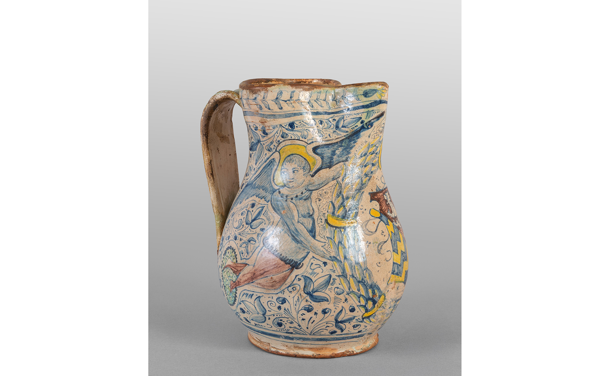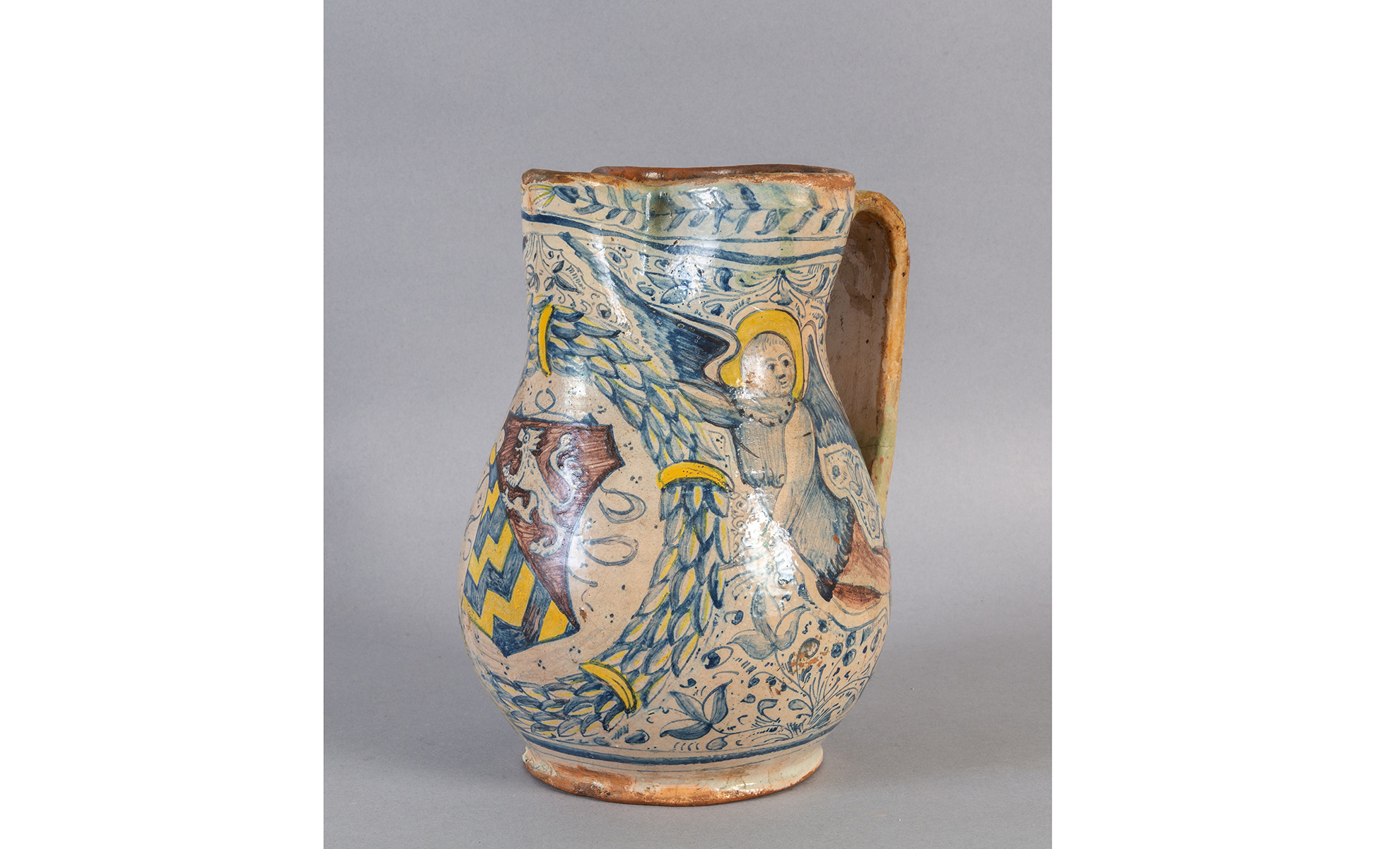 Versatoio in ceramica decorato in policromia con cherubini e stemma della Famiglia Rucellai Montelupo sec.XVI
