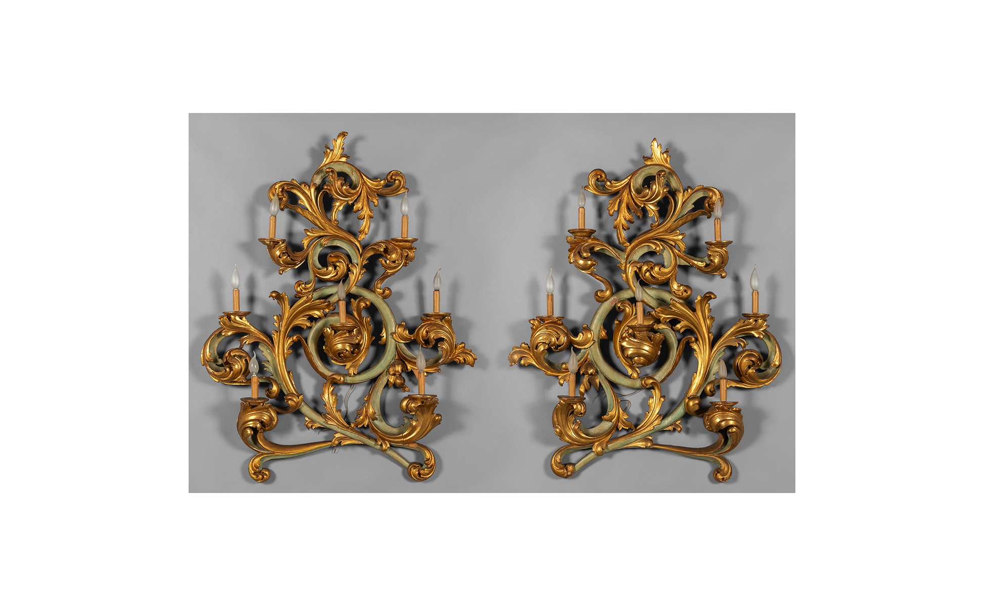 Coppia di grandi apliques a sette luci in legno intagliato e laccato a volute sec.XIX
