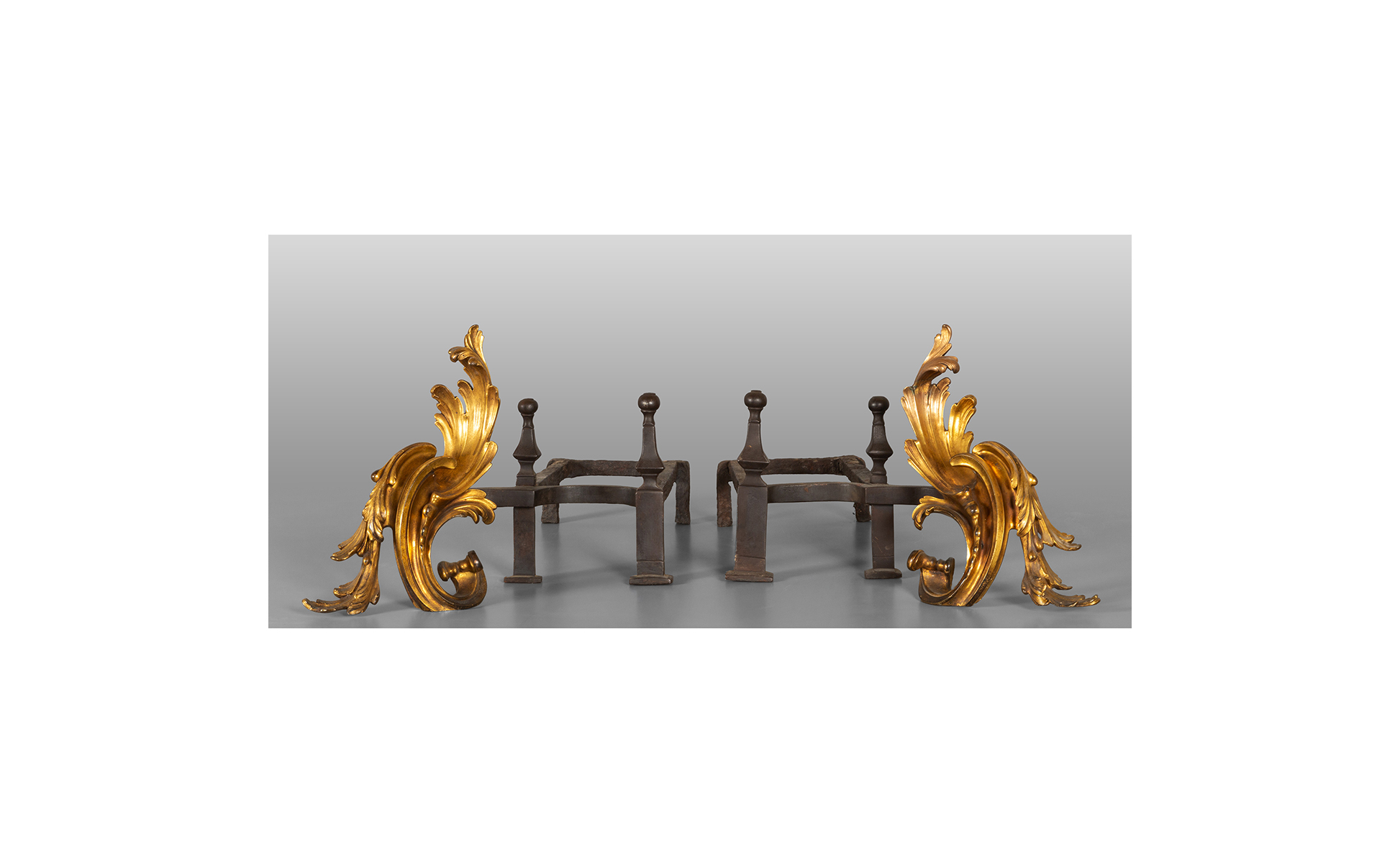 Coppia di alari Luigi XV in bronzo dorato Francia metà sec.XVIII