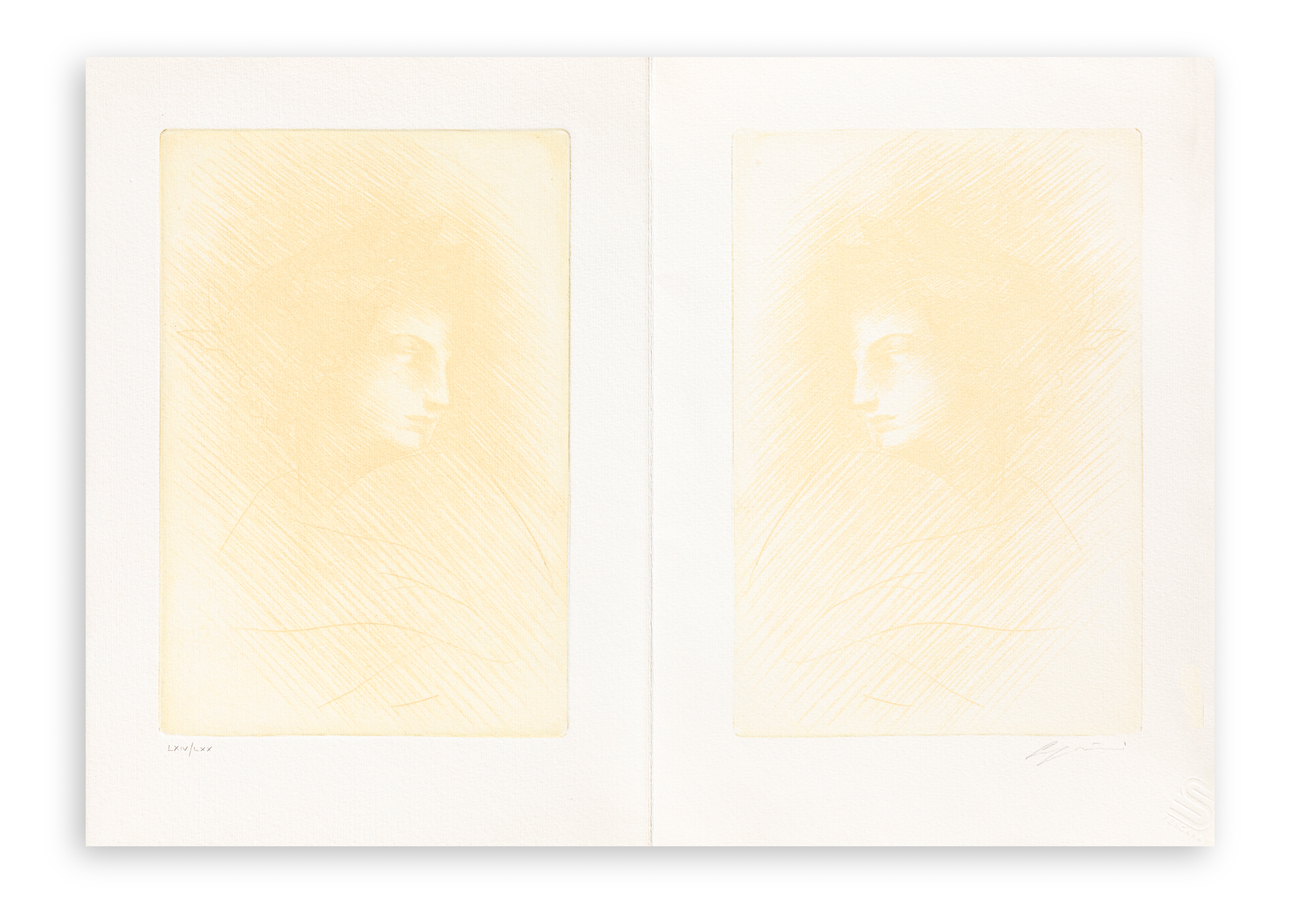 Folder contenente una incisione alla vernice molle di Omar Galliani in colore giallo-ocra